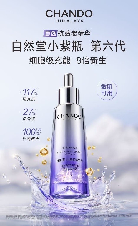 作为官宣系列主推产品,自然堂小紫瓶第六代首创“抗疲老”科技,专攻垮脸疲老,以极地酵母喜默因发酵滤液®和溶胞物组合,8倍细胞级新生,一夜焕亮、紧致、透嫩、淡纹,为肌肤赋能满满活力。