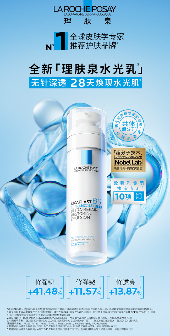 作为本次官宣同步推出的核心力作,理肤泉水光乳以创新科技引领科学护肤迈入全新阶段。产品搭载品牌联合诺奖科学家实验室研发的独家专利2,创新应用科学家曾三次获得诺贝尔化学奖认可的超分子技术。该技术通过超分子化学反应,生成新的分子间“榫卯”结构——共体超分子【B5+红没药醇】成分,突破单一成分功效天花板。产品复配胶原酵母菌3等皮肤学级成分协同增效,进一步拓展了科学修护的更多可能性。