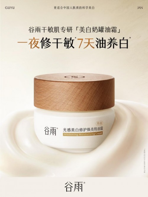 谷雨美白奶罐油霜:新一代滋润型美白油霜,以极光甘草为核心,搭配26.8%奢润油脂与细胞级修护体系,不仅实现高效美白,更同步修护干燥脆弱肌,做到“美白不刺激,修护更稳白”。