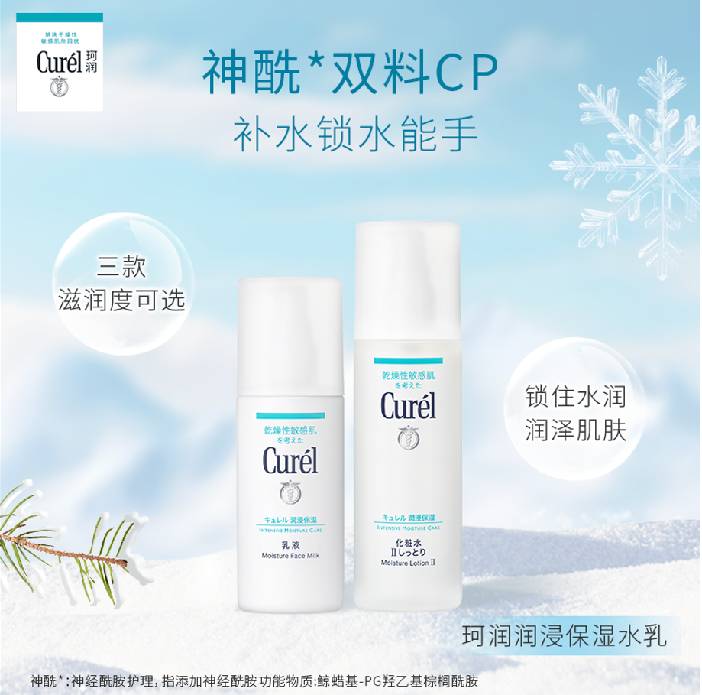 随着气温下降,肌肤的新陈代谢逐渐降低,皮肤会因皮脂腺分泌减少、失去较多水分而变紧绷、发干。寒风的剌激和室内暖气都会让皮肤变得粗糙暗淡,缺乏弹性。珂润润浸保湿化妆水,3款滋润度可选,添加蓝桉叶提取物,打造不易干燥、平滑盈润的肌肤,乳液另外添加神经酰胺功能物质*,滋润至角质层、使肌肤不易粗糙,帮助塑造盈润肌肤。