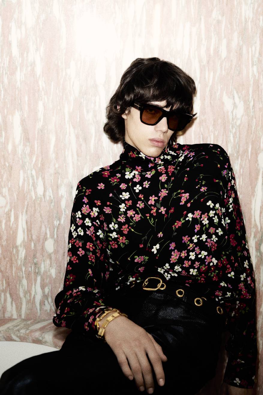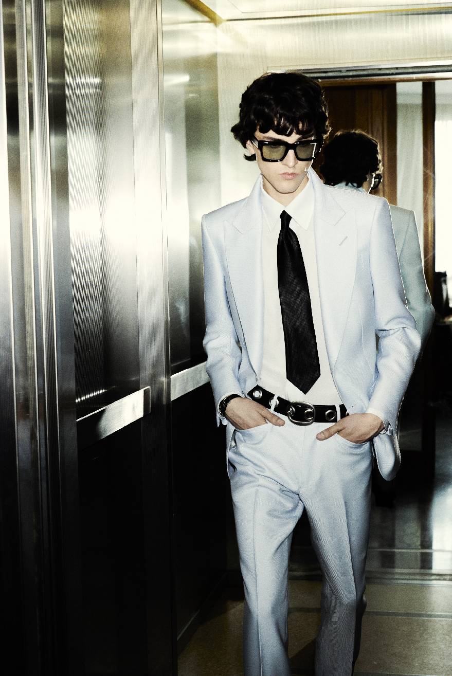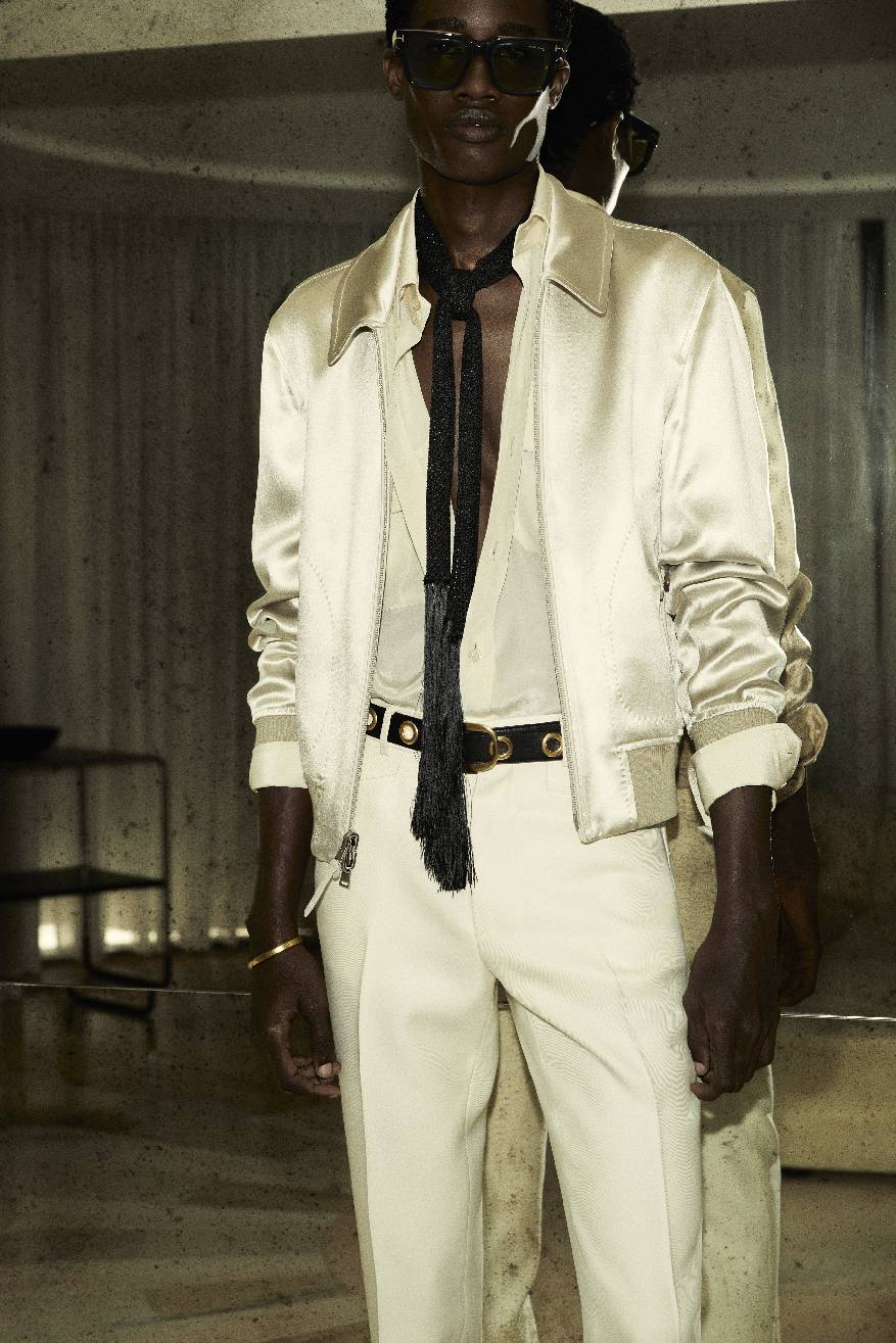 2025夏季男装系列旨在展现服饰赋予的纯粹喜悦,以鲜明而高雅的慵懒美学吸引目光,享受被瞩目的快乐。传统的绅士着装法则与性别界限被轻松颠覆:金属质感的豹纹搭配柔美的蝴蝶结丝绸衬衫,双绉面料上绽放着繁复花卉的高领衬衫。本系列中洋溢着20世纪60年代“摇摆伦敦”的闲适风情:修身剪裁与宽松衬衫相得益彰,细长围巾与天鹅绒低腰裤搭配,再踏上一双漫不经心的乐福鞋。TOM FORD男士偏爱利落的翻领西装,也不忘宽松的束腰短皮夹克,或是白色真皮与丝绸制成的风衣。皮带上镶嵌的金属圆环,以及黑白细条纹设计,无不透露出一抹摇滚气息。夜晚,他倾向于闪耀:金色豹纹提花夹克、紧身亮片外套、黑色提花长裤,还有缎面飞行员夹克,都是他的心头好。