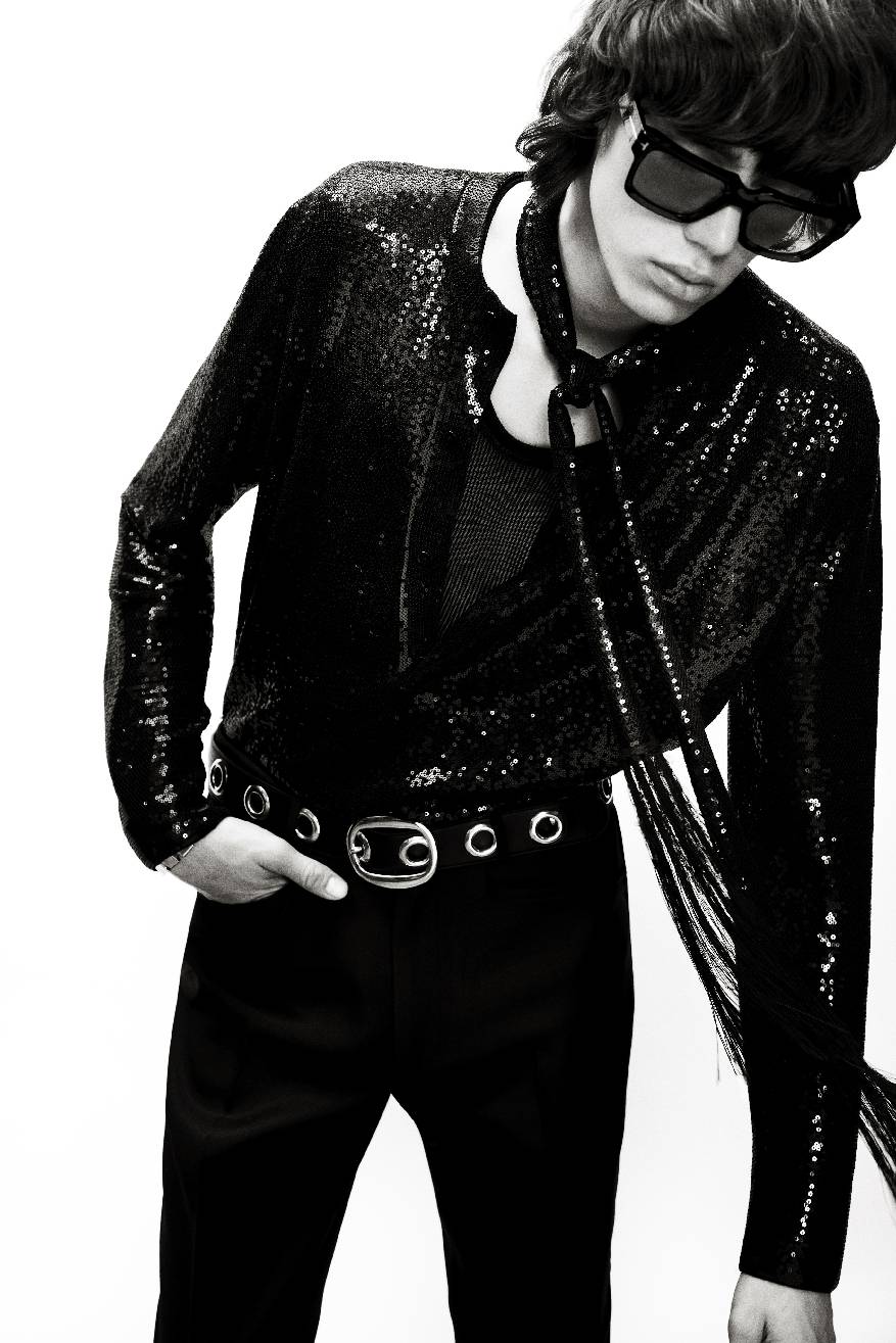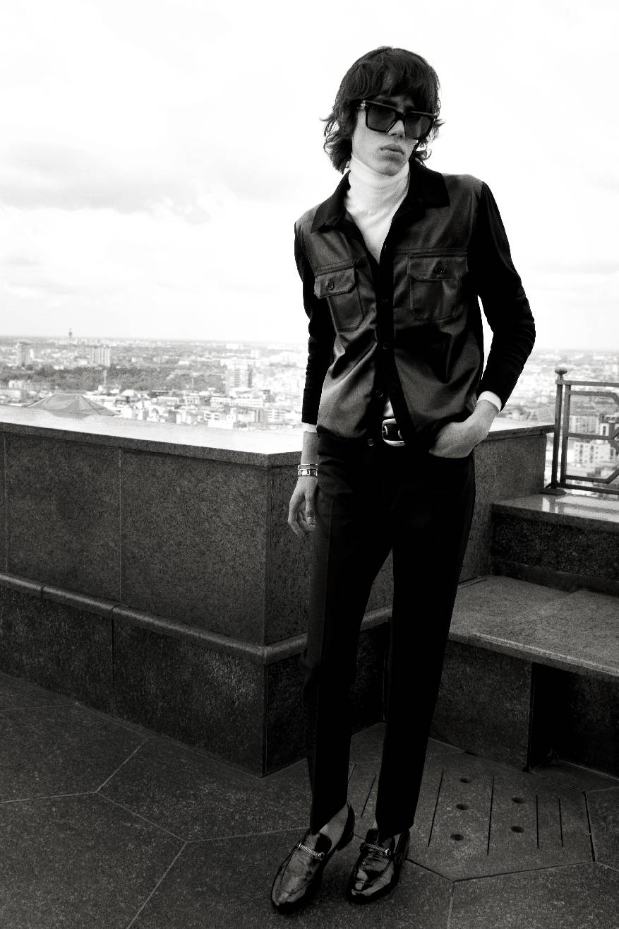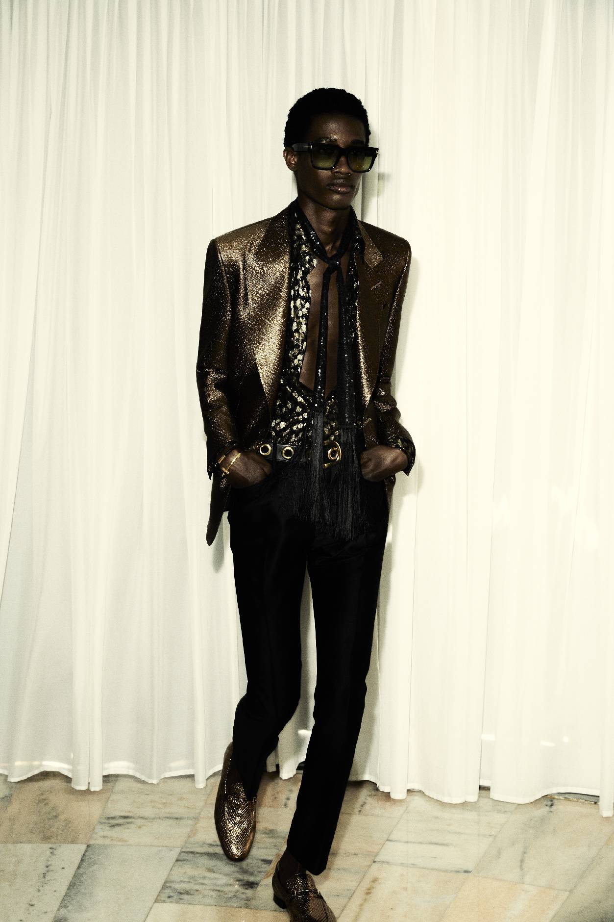 2025夏季男装系列旨在展现服饰赋予的纯粹喜悦,以鲜明而高雅的慵懒美学吸引目光,享受被瞩目的快乐。传统的绅士着装法则与性别界限被轻松颠覆:金属质感的豹纹搭配柔美的蝴蝶结丝绸衬衫,双绉面料上绽放着繁复花卉的高领衬衫。本系列中洋溢着20世纪60年代“摇摆伦敦”的闲适风情:修身剪裁与宽松衬衫相得益彰,细长围巾与天鹅绒低腰裤搭配,再踏上一双漫不经心的乐福鞋。TOM FORD男士偏爱利落的翻领西装,也不忘宽松的束腰短皮夹克,或是白色真皮与丝绸制成的风衣。皮带上镶嵌的金属圆环,以及黑白细条纹设计,无不透露出一抹摇滚气息。夜晚,他倾向于闪耀:金色豹纹提花夹克、紧身亮片外套、黑色提花长裤,还有缎面飞行员夹克,都是他的心头好。
