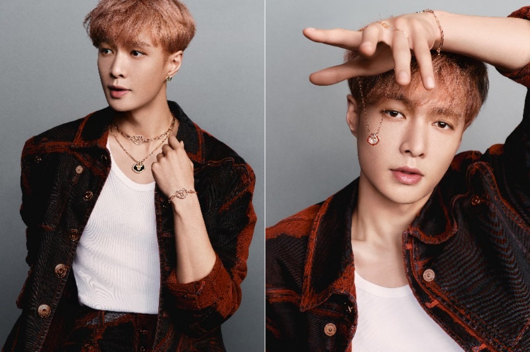 左:全球品牌代言人张艺兴配戴Qeelin Yu Yi系列18K玫瑰金钻石颈圈、18K黄金钻石及黑翡翠项链、18K玫瑰金钻石手链