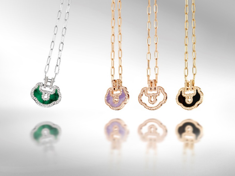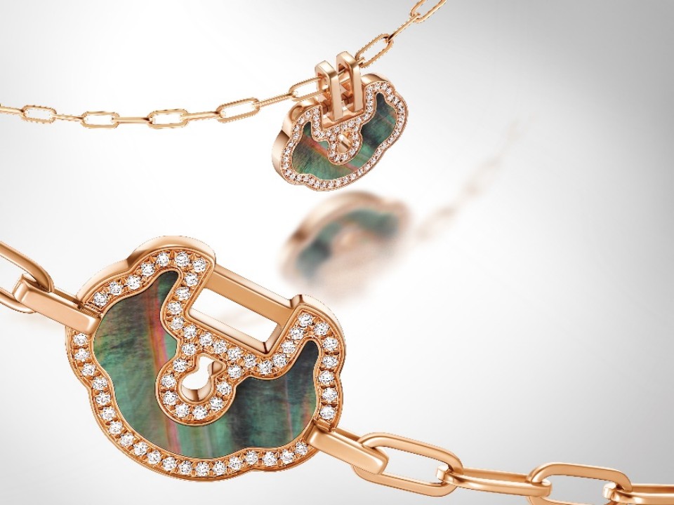 上:Qeelin Yu Yi系列18K玫瑰金钻石及黑珍珠母贝项链