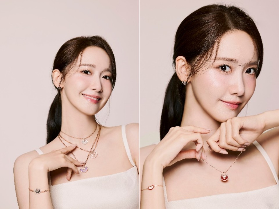 左:品牌代言人林允儿配戴Qeelin Yu Yi系列18K玫瑰金钻石及白珍珠母贝项链、18K玫瑰金钻石项链、18K玫瑰金钻石及紫玉翡翠项链、Yu Yi系列18K玫瑰金钻石及黑珍珠母贝耳环及手链