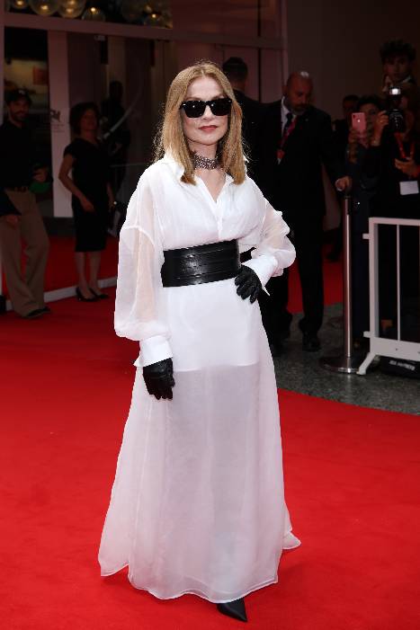 法国演员伊莎贝尔·于佩尔(Isabelle Huppert)身着Brunello Cucinelli特别定制白色欧根纱礼服,佩戴新季纯黑色Mr. Brunello太阳眼镜及鞋履配饰,优雅亮相第81届威尼斯国际电影节。黑与白执笔,诠释巨星的传奇风采。