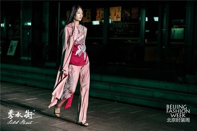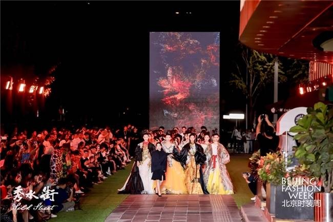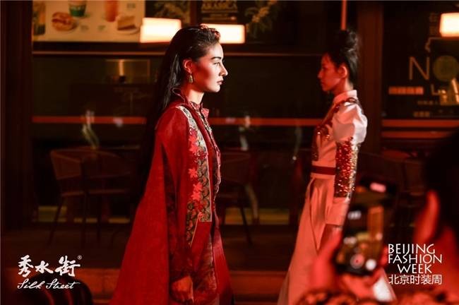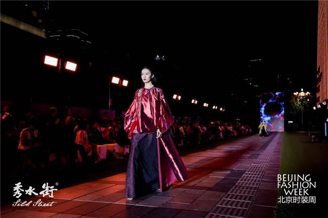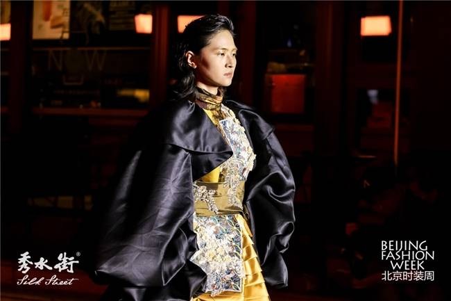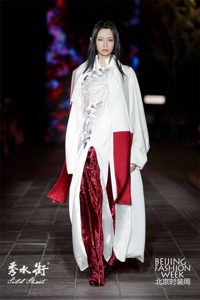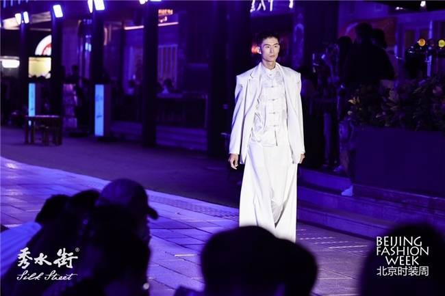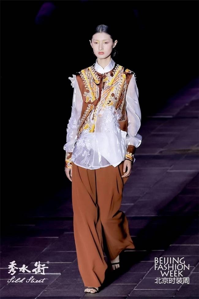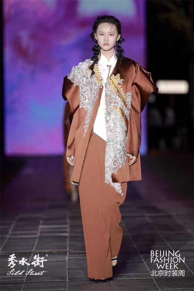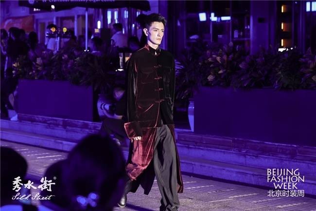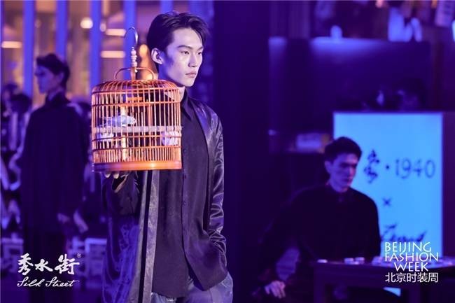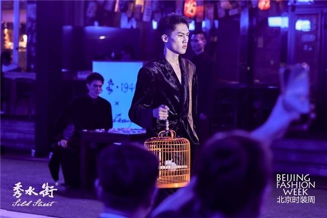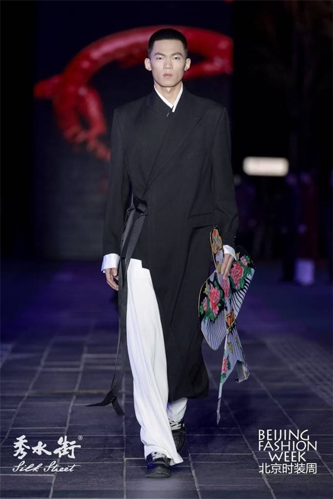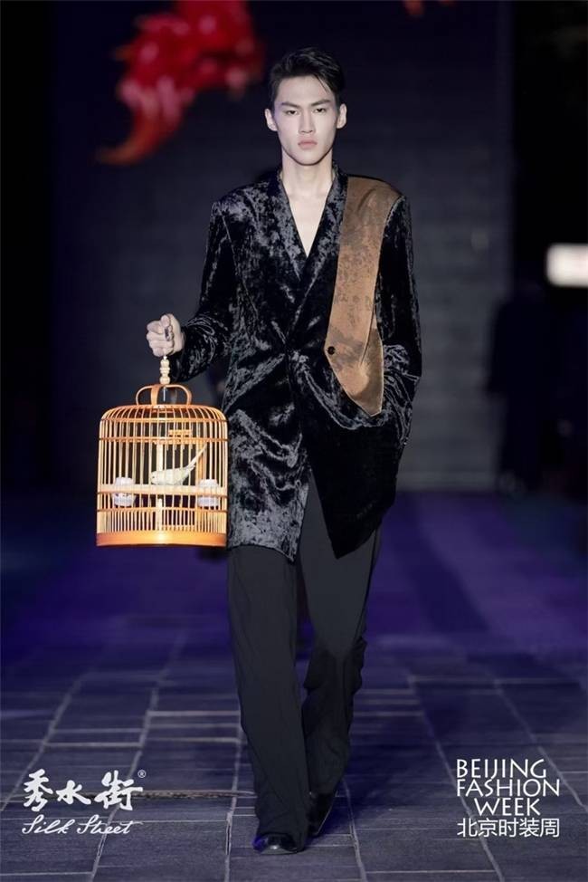 发布会的开场,以对遛鸟、下棋、风筝、太极这四种在北京胡同和公园曾遇见的行为印象作为创作灵感,将鸟笼的棕黄、象棋的红黑、风筝的红蓝绿、太极的黑白作为主要色彩,西装外套与风衣结合长衫立领、对襟盘扣、斜襟系带,再以具有西式格调的厚丝绒与中式气韵的真丝提花相碰撞,尝试将北京胡同中现代生活与传统气息融入服装。