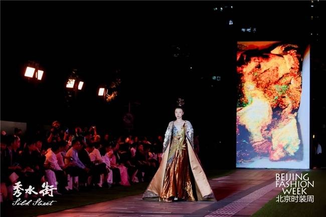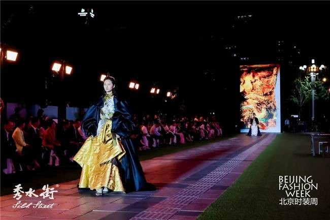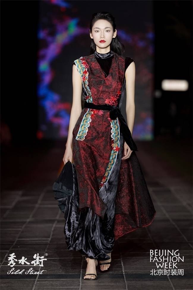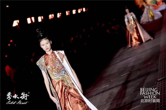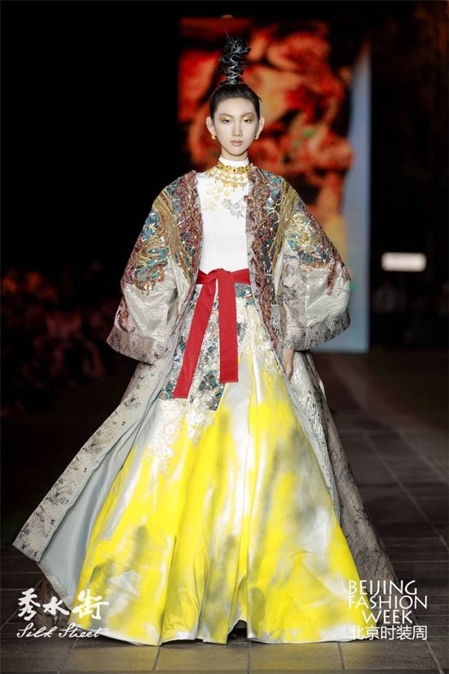 《秋》系列:选择了北京秋季观赏性最佳的枫叶与银杏,枫叶如火焰般燃烧的红搭配银杏闪烁的金黄,将多种肌理感面料进行拼接与组合搭配呈现秋风落叶的垂落感与交叠感,再以北京屋顶传统的瓦当滴水结构作为刺绣灵感,展现秋日中落叶堆积于瓦片中的浪漫景象。
