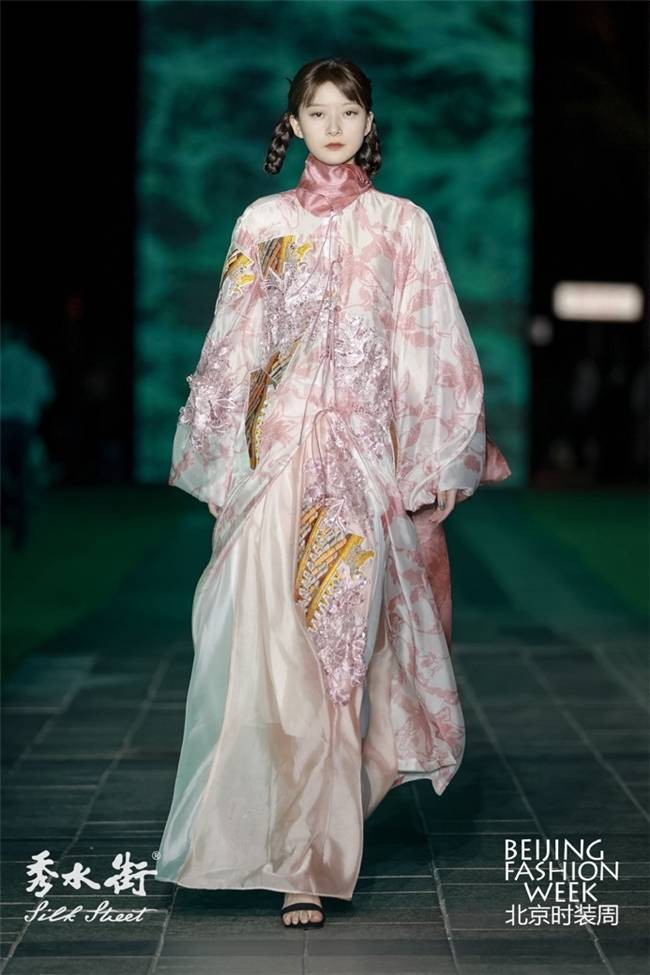 《春》系列:选择北京春季绽放的杏花与海棠作为元素,将花卉的色彩与结构进行提炼并融入到飘逸的版型与缤纷的面料中,再以北京故宫建筑构造中的五脊六兽作为刺绣图案,搭配华丽的花卉式钉珠与立体刺绣,呈现春日里一次仰头看见过屋檐与花枝相配的记忆。