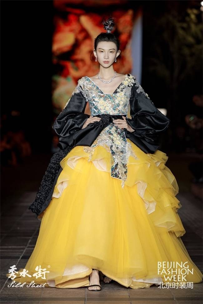 《冬》系列:将冬日里结霜的柿子与寒风中屹立的腊梅作为元素,分别将柿子的橘色调搭配糖霜的白,腊梅的黄搭配寒夜中的黑作为本系列礼服的主色调,在剪裁上以华丽的长袍结合层次错落、蓬松拖地的裙摆,融合以故宫养心殿的轱辘钱样式花窗图案的大面积刺绣,再搭配大量耀眼夺目的重工钉珠、亮片、立体刺绣,呈现出银装素裹的寒冬中那一缕暖阳下的熠熠生辉。