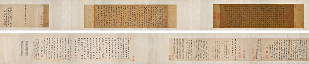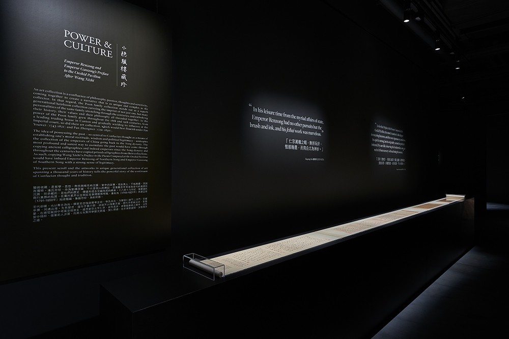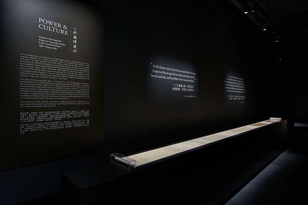 赵室四代后,宋朝第十位皇帝高宗,又即南宋开国君主,也临《兰亭》。遥想当日御书临摹羲之兰亭,高宗向高古先贤拜学艺文底蕴,在手挥笔运间,深悟传承之道,体现在金人入侵且赵室被迫迁逃之下,惟承袭北宋政治文化传统,尚古尊祖,图藉此宣扬皇权正统。二帝法书合装一卷,题跋自南宋至清代道光,跨越七世纪。直至道光年间,宋代宸翰乃与《定武兰亭唐榻本》共裱一卷,但现已分道扬镳。 潘家珍存此卷,从潘正炜的听颿楼到潘祖尧的小听颿楼,逾一百七十寒暑。仇国仕补充:「宋代御藏,也以尊古为尚。中国经典强调尚古与敬尊,乃慧智仁德不二法门,君权承袭,同遵此理。先哲慧思,蕴存字里行间,遂赵宋以降数百载,历代帝君藏法帖、勤临摹,在横竖撇捺中寻觅至理箴言。」