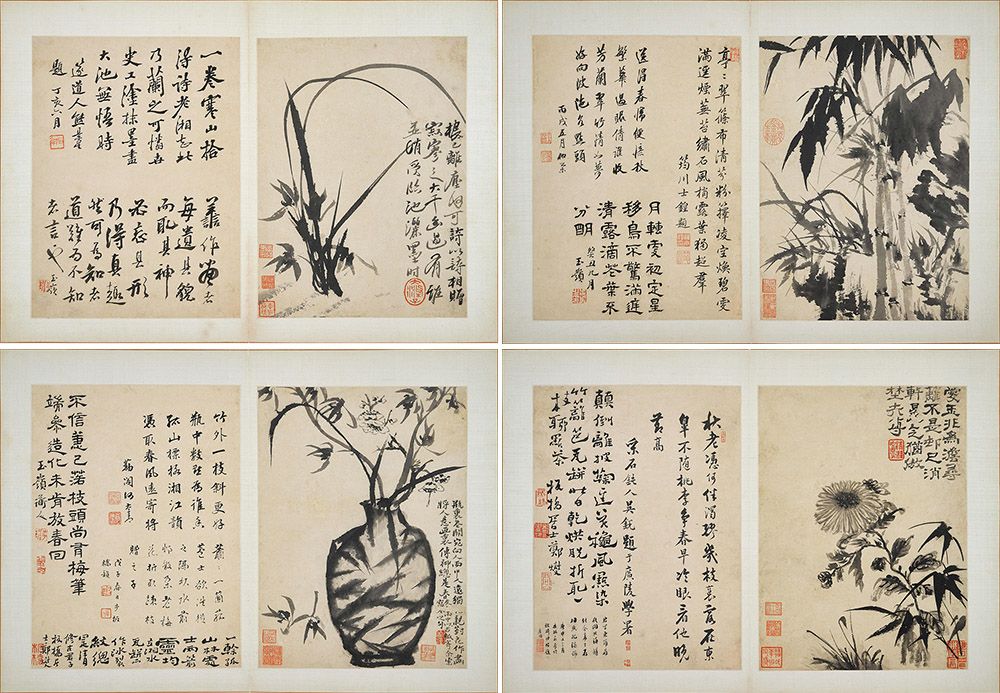 此册共八开,分别绘兰花、芭蕉、墨竹、甁花、秋菊、水仙等,每开有郑板桥的对题,此外题者还有孔广陶、吴荣光、熊景星、吴锐、汪之锽、李步墀。郑板桥的花卉受到石涛的深刻影响,他一生留下了许多评论石涛的文字,如《清湘老人题记》的附录就有多则,可知他一生看过不少石涛的书画。郑板桥生前没有见过石涛,也非石涛门人,但与石涛的弟子多有往来。此册墨趣横生、笔力劲道,为石涛较高水平的花卉题材作品。著录于潘正炜《听颿楼书画记》,原有十开,惜已遗失两开。