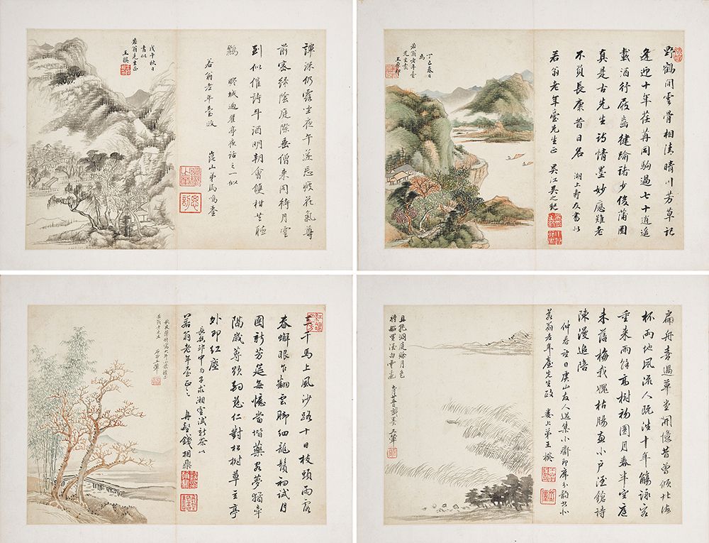 此册汇集清初「虞山」及「娄东」各名家,体现「画学正统」之面貌,记录文人诗文相酬。上款人「若翁」,即袁若遗,名国梓,字丹叔,淞江人(今上海),顺治己丑进士,官至衢州、平阳、嘉兴知府、刑部郎中员外郎主事。此册后传至其孙袁秉直,袁秉直字柏田,颇显于时,历江西布政使、福州知府。袁氏为江南望族,诗书传家,名冠一时。袁秉直宦游四方,经常邀约当时官场名仕与文坛名贤共赏此册,于是留有嘉道时期题跋十几种。