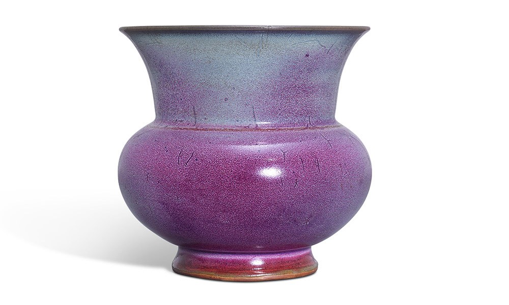 明十五世纪初 钧窑玫瑰紫釉渣斗式花盆 底刻「三」字