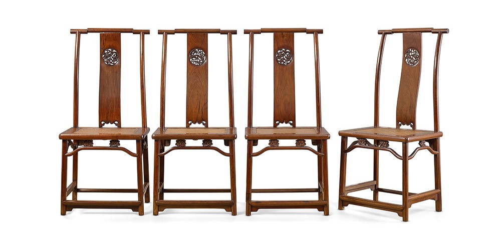 此类座椅清秀巧妙,因靠背板窄束,形似竹制灯挂,乃得京城木匠起名灯挂椅。靠背椅不带扶手,昔日多倚墙而置以作备用,不似正规圈椅般拘谨,用途较广。一般四椅成堂而制,但经年累月,多有佚失。此组灯挂椅严选佳木,造形流丽,尽展中国家具简约典雅,彰显黄花梨木纹之美。靠背板透雕开光,作灵芝纹,搭脑呈阶梯错落有致,虽状若断续,实取整木而作。坐面下壸门亮脚,正中双卡子花,腿间步步高赶枨,如是种种皆已殊罕,而四件成堂则更难求。