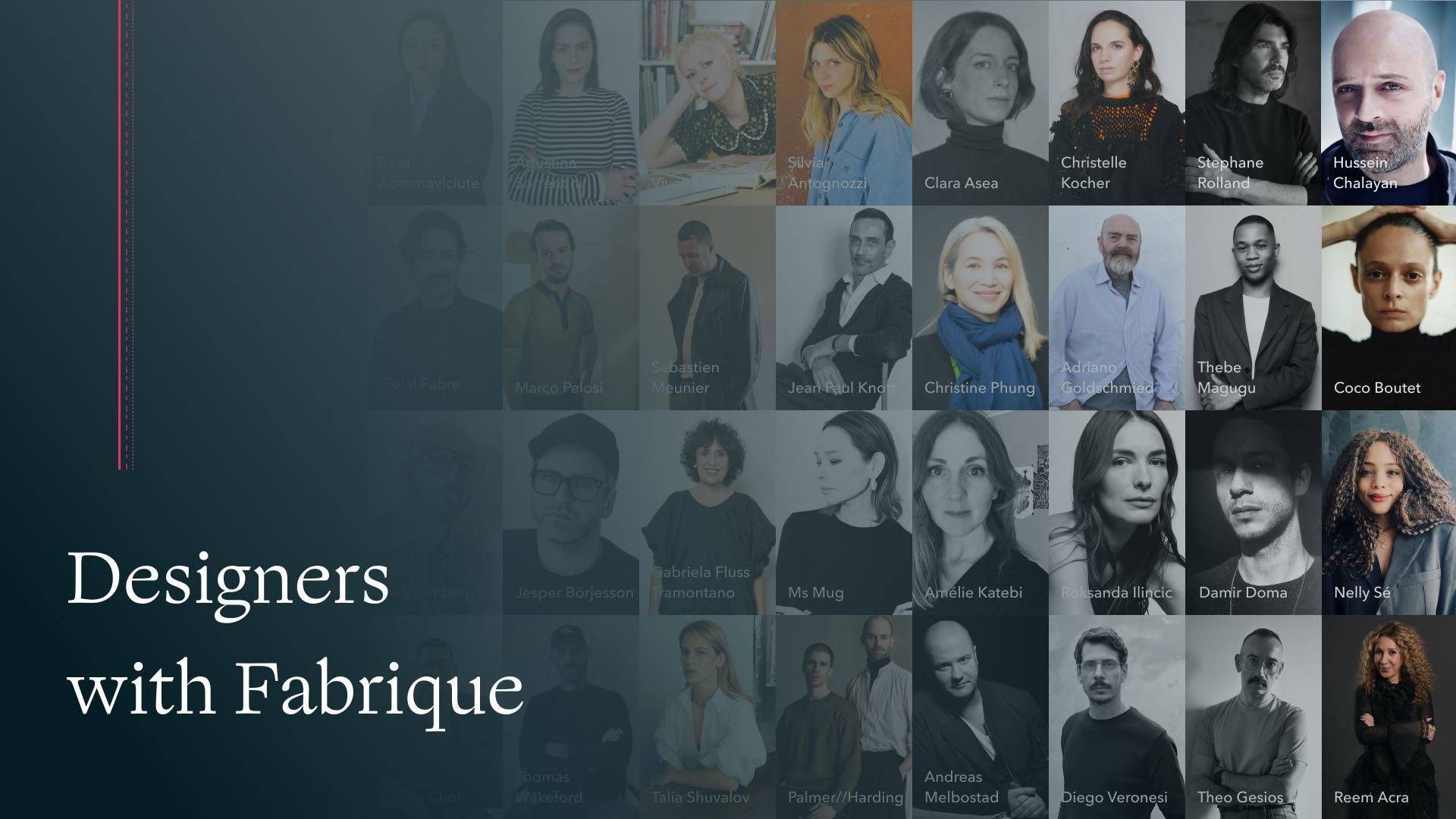 Fabrique由两位来自电影、传媒行业的女性创办。 Fabrique集结了300余位来自全球的优秀设计师,每周推出设计师系列独家作品,以尊重设计,相信设计的力量;为设计师与用户建立最有价值的连接;相信时尚的长期主义为品牌价值观,为现代女性打造完整衣橱。Fabrique围绕风格、时尚与设计师进行对话,被VOGUE、Harper’s Bazaar、ELLE、WWD等时尚媒体多次推崇和报道。