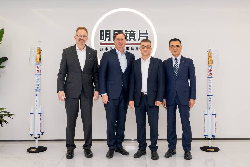 图|从左到右依次是,徕卡视光全球董事总经理 Joerg Bauer、徕卡全球CEO Matthias Harsch、明月镜片董事长谢公晚、明月镜片总裁谢公兴