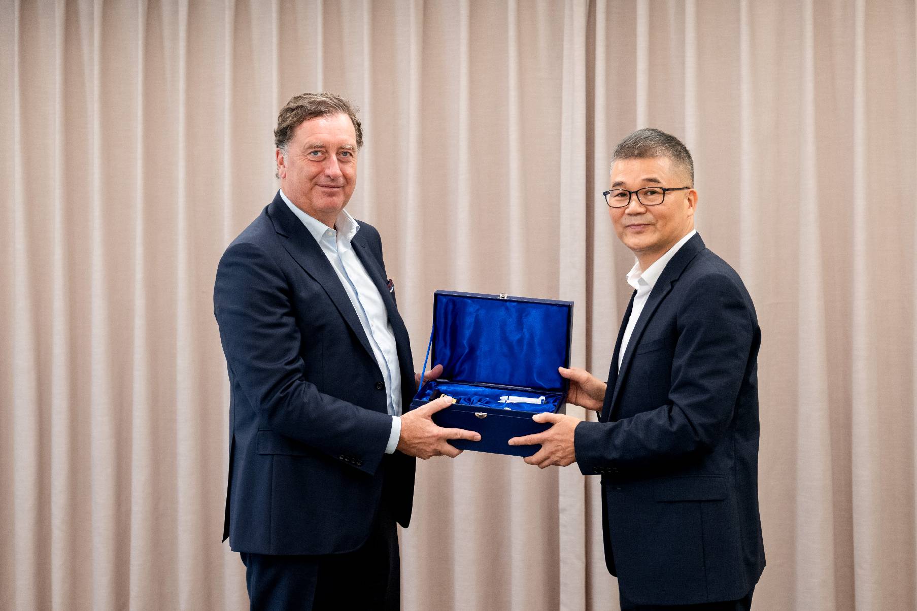 图|明月镜片董事长谢公晚向徕卡全球CEO Matthias Harsch赠送明月与中国航天定制款模型