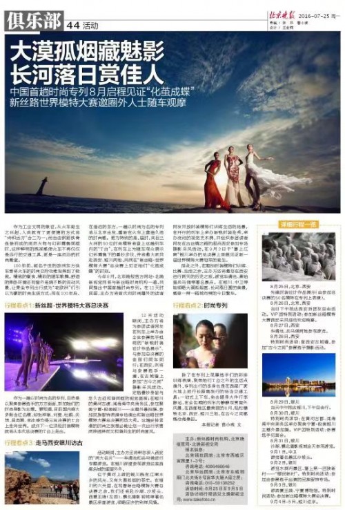 2016年,比赛期间,自北京开往银川的时尚专列就是一次重要尝试。来自全球的参赛选手和媒体记者以及慕名而来的游客,同乘一趟列车共赴比赛最终目的地,众选手在车上演绎了一场“奔驰的T型台”更是创下了时尚史上的佳话。北京晚报给予8个专版的报道,引起了社会各界的关注。