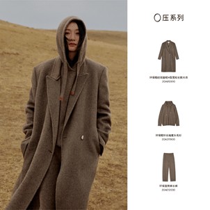 置身草原,周迅被整套牦牛绒材质的衣物温暖包裹,环保粗针长袖套头毛衫,卫衣式的宽松剪裁和优质牦牛绒毛料,自然而随性,与同套环保直筒裤长裤搭配,整体造型和谐统一;外套搭配环保粗纺双面呢H型宽松长款大衣,经典枪驳领设计和oversize版型大气而不羁,袖口流苏细节增添灵动与优雅。