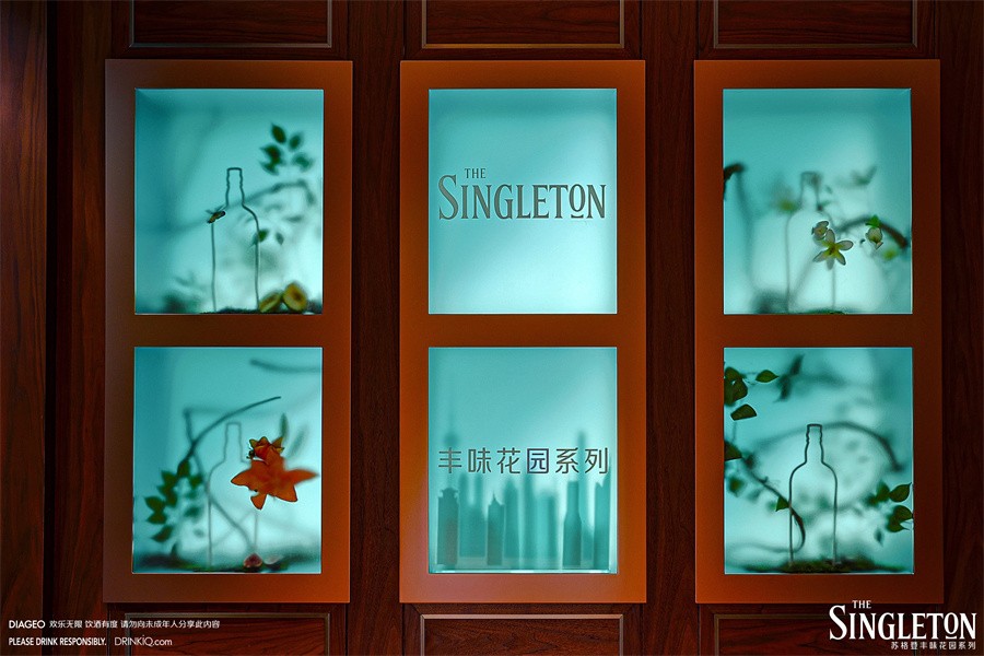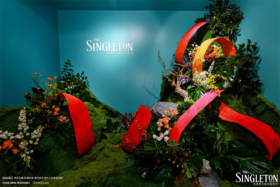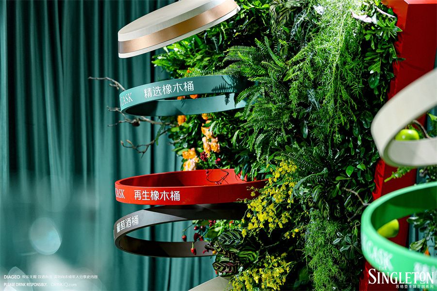 入口处的打卡区作为本次苏格登丰味花园系列的主要品牌展示区,向宾客还原一座赋有生命力的花园。交织的色彩锦缎像是流动的酒液穿越四季。从轻盈的青草香调逐渐演变为成熟花园、甜美香料,直到浓郁森林的木香。超过30种珍贵花卉相伴在流淌的酒液周围,以交织的色彩打造致美视觉,自此将宾客引入纷繁的“丰味花园”。