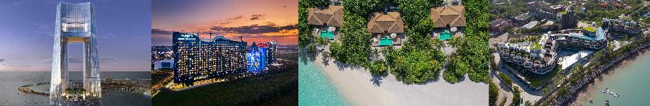 从左至右依次为:洲至奢选迪拜Ciel Tower酒店、洲至奢选上海冰雪世界酒店、洲至奢选马尔代夫诺库度假村、洲至奢选香港WM酒店