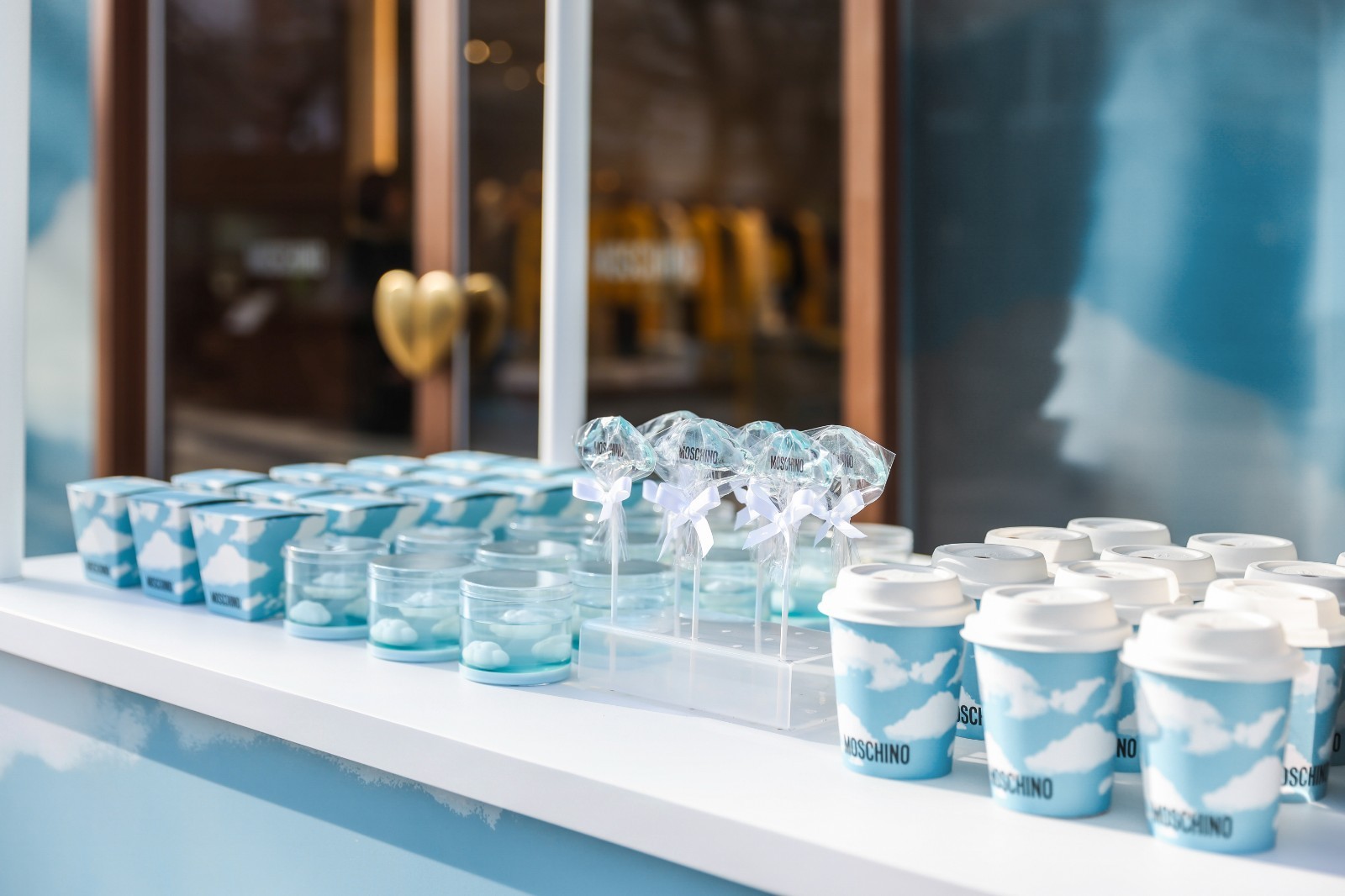 店面的外立面由标志性的蓝天白云构成,格外引人注目。室内设计融合了独特的图形风格与建筑美学:棋盘格地面由黑白双色大理石打造而成,法式座椅配以鲜艳的黄色与笑脸标志、镶嵌优雅古典装饰线条的金属挂架,以及意大利手工打造的精致工作台,展现出别具一格的设计风格,为整个空间带来了无与伦比的优雅与艺术感。