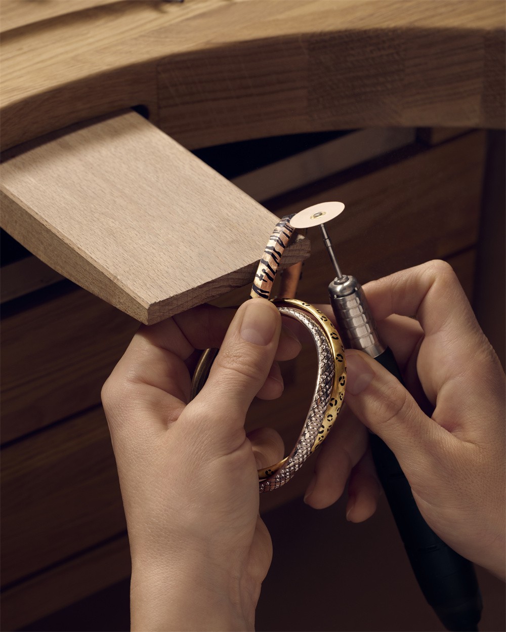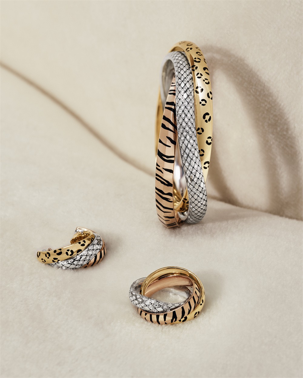 每枚环圈皆饰以动物图纹,引发无限遐想:白金环圈上的蛇鳞起伏延绵,黄金和玫瑰金环圈以黑漆勾勒的豹斑和虎纹,分别呈现圆润饱满或立体分明的造型。