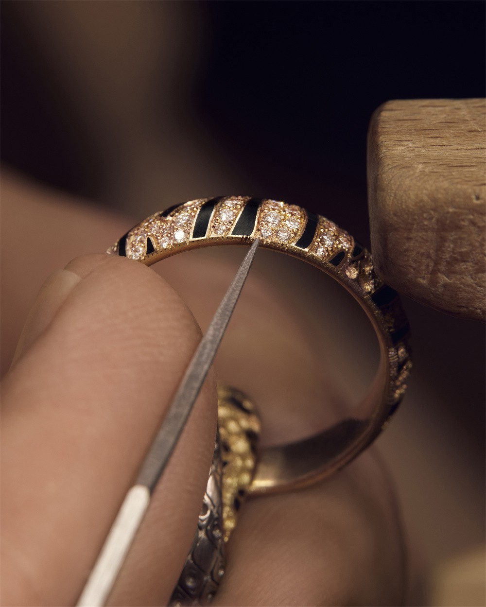 所有黑漆图案均由卡地亚工匠以精湛技艺打造,而铺镶钻石款则运用了雕刻玫瑰金和黄金环圈边缘的特殊工艺,使其呈现精巧细密的手工“千纹”(Mille Traits)。