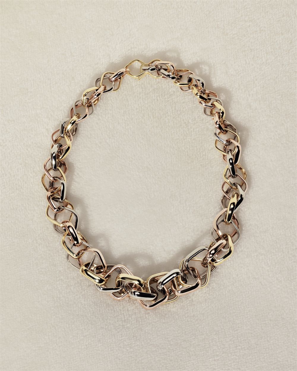 尺寸各异的枕形环圈,由小到大依次交织。超大号款项链由品牌工匠手工组装而成,珍贵链节环环相扣,于颈间展现精妙编织的造型美感。