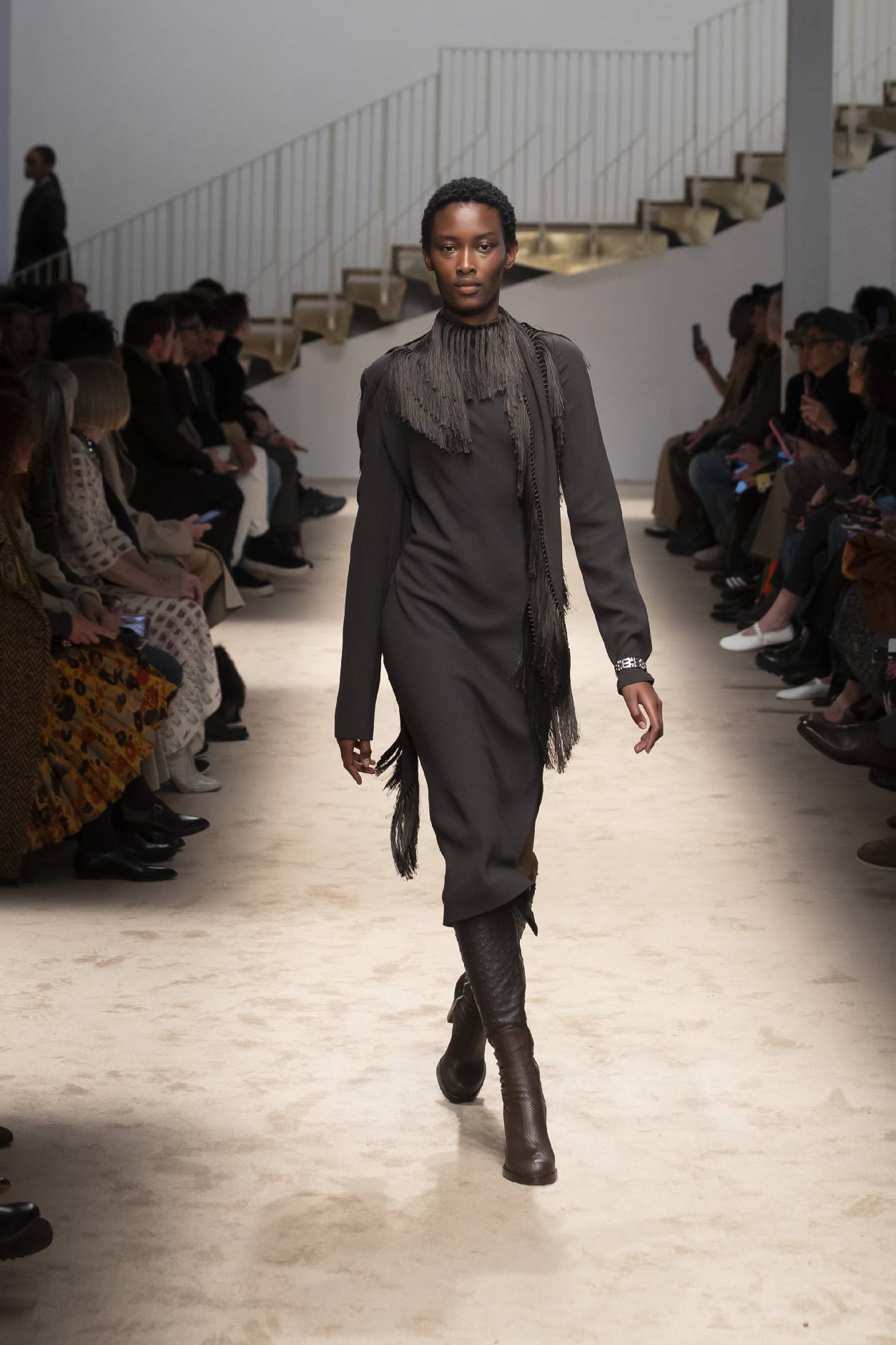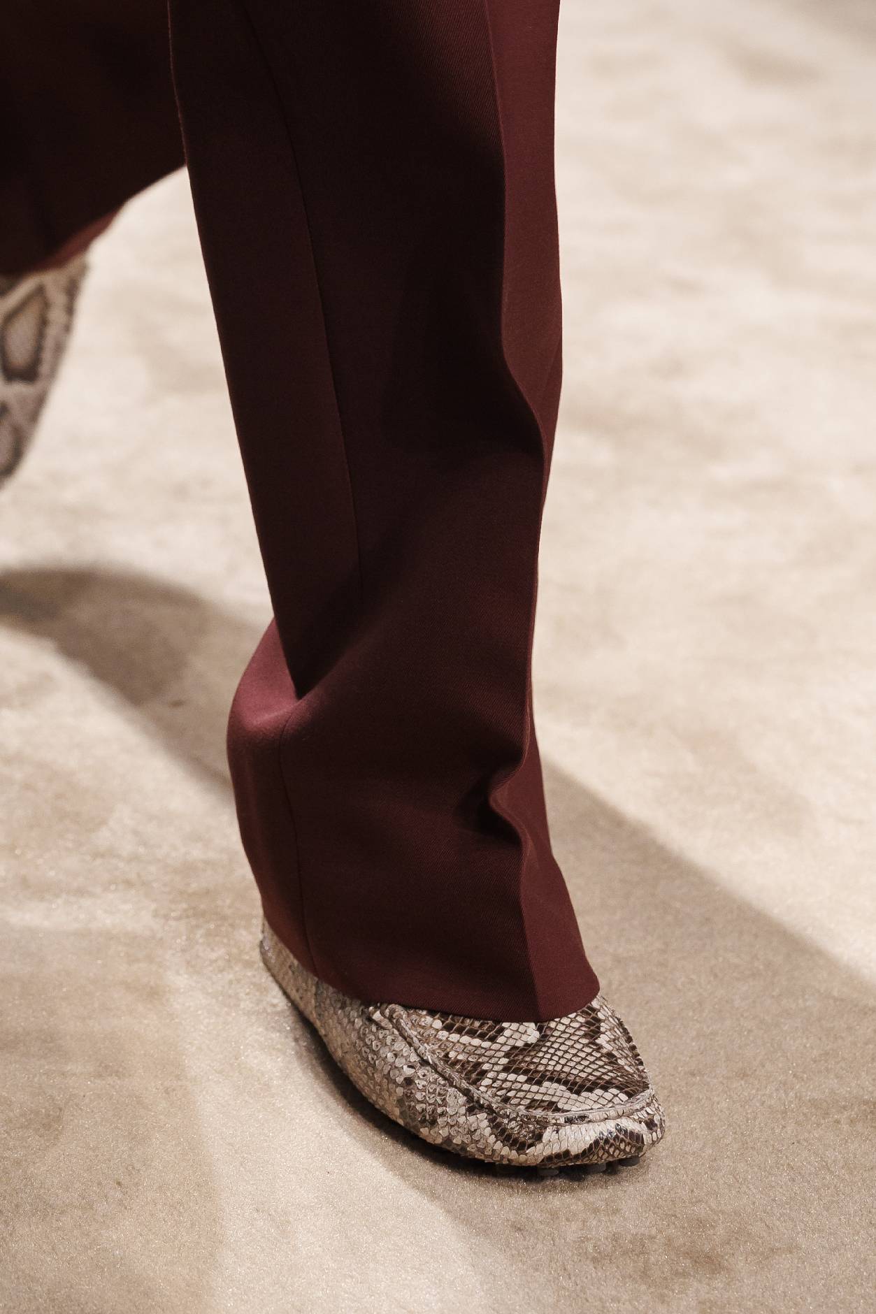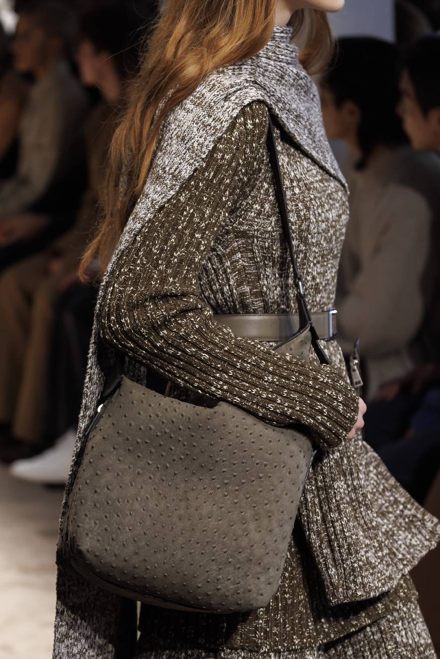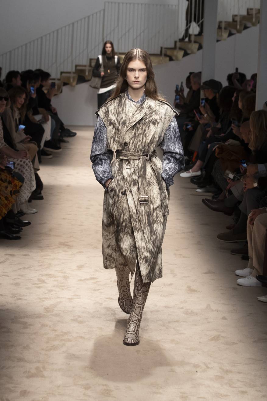 本季成衣继续深化对于皮革及不同材质搭配碰撞的衣橱灵感探索。如花苞形的皮革半裙搭配贴身柔软的同色系针织衫,打造出一紧一松的廓形比对;高开叉皮革半裙搭配花呢面料上装,或是花呢面料打造的连衣裙装,以浪漫的面料流苏点睛设计,构成令人惊喜的视觉享受。动物花纹及皮毛元素搭载量感十足的廓形风衣造型,率性、飒爽、不拘一格。