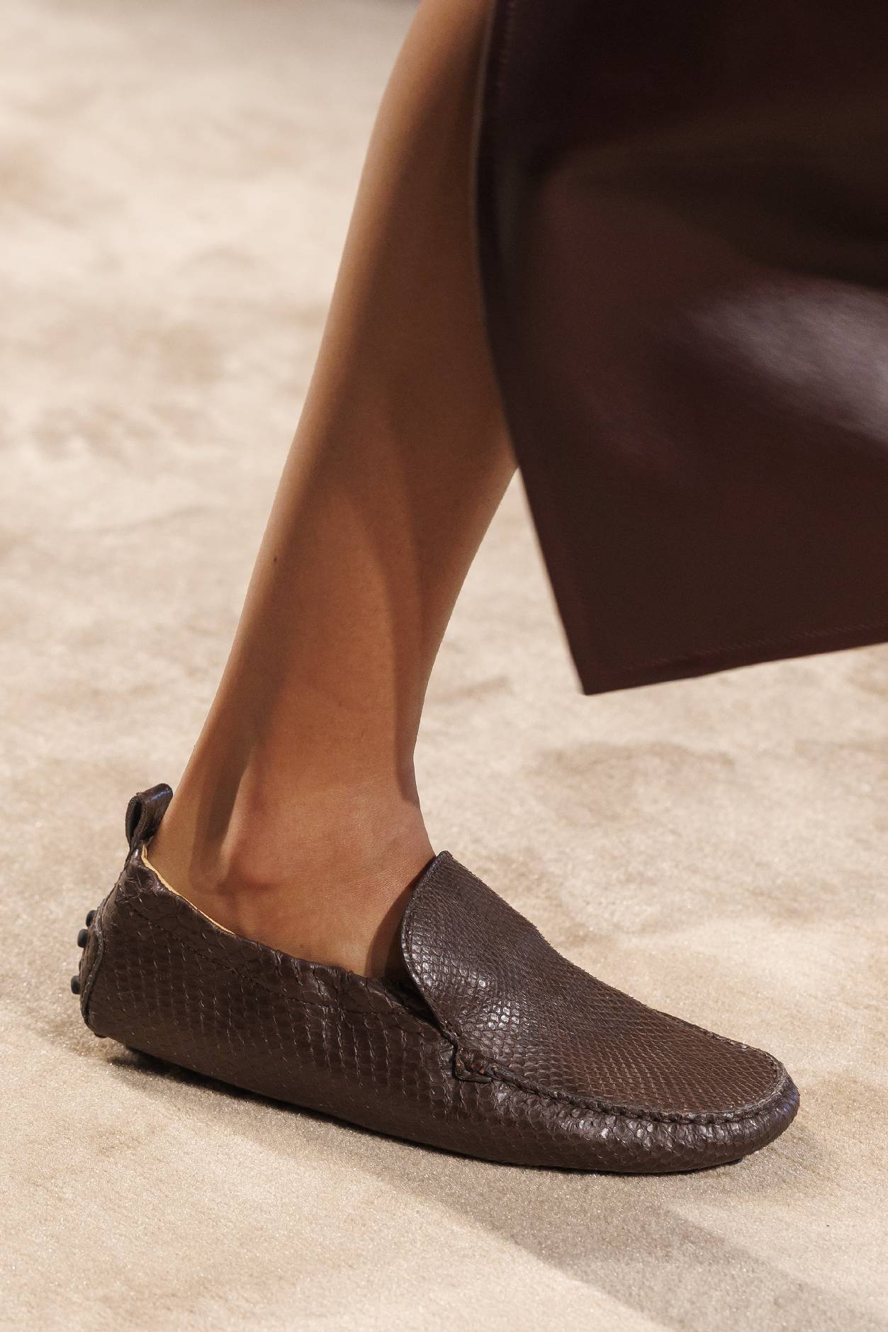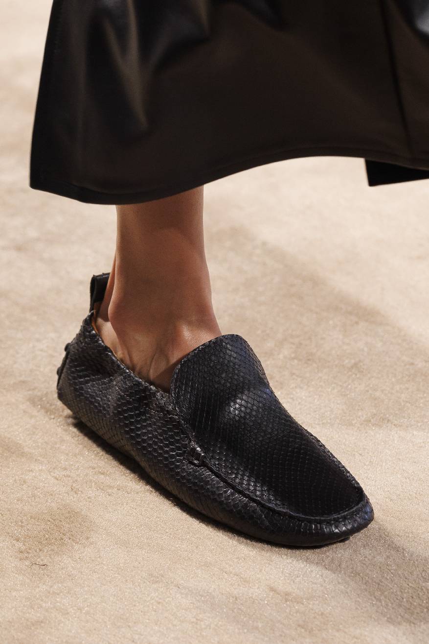 Gommino系列豆豆鞋持续扮演着不可或缺的主角角色。本季Glove豆豆鞋再度深耕匠艺精髓,臻选包括顶级Nappa皮革在内的多种材质,更突破性引入稀有蟒蛇皮,精心打造出别具一格的“手套”款式。皮革原料经由匠人精心手工裁剪与鞣制塑形,标志性橡胶豆豆大底在优雅风尚中注入人体工学考量,使其在先锋探索与经典基因间始终保持着视觉上的绝对焦点。