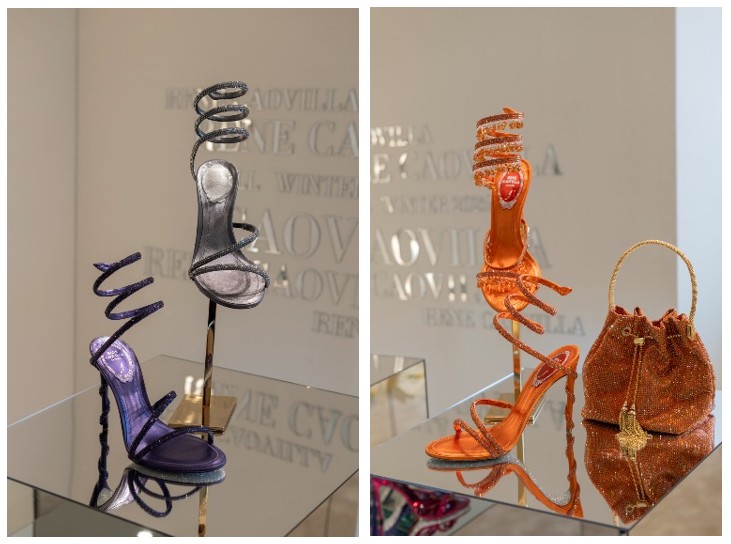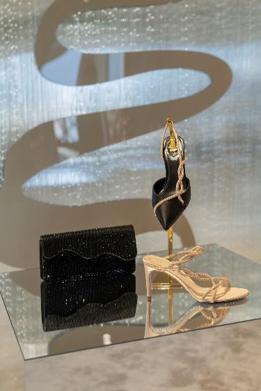 Spark系列在2025秋冬季惊艳亮相,标志性蛇形缠绕由一连串明亮夺目的长条水晶构成,沿着脚踝蜿蜒而上。鞋面有紫色、橙色和灰色金属材质,也有蓝色、紫色和覆盆子色天鹅绒材质可供选择,包含凉鞋、过膝靴和踝靴,以及黑色弹力纳帕皮革,以满足多种穿着需求。