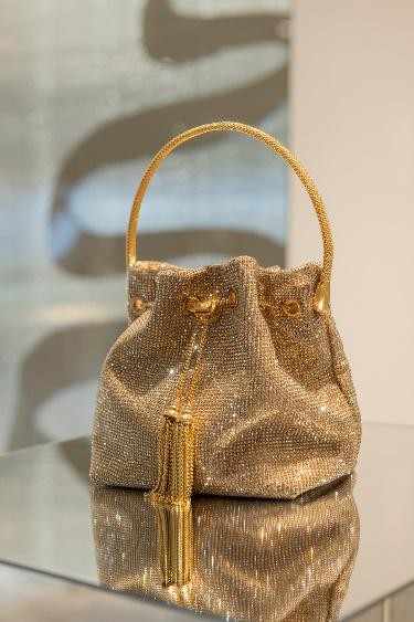 这款小巧而精致的水桶包镶满水钻,冬日夕阳的橙色与金色色调遥相呼应,另有黑色天鹅绒版本。