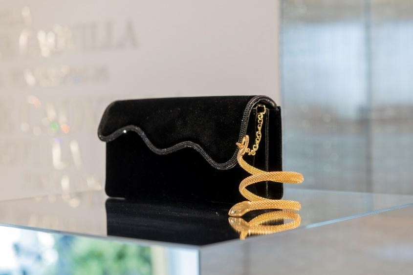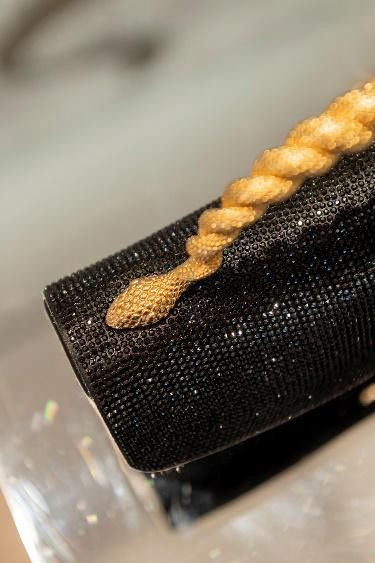 全身镶满黑色水钻的晚宴包Bauletto,配有镶钻蛇形手柄,是出席流光溢彩的重要场合的不二之选。