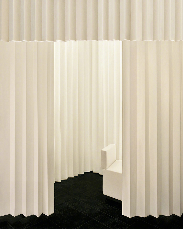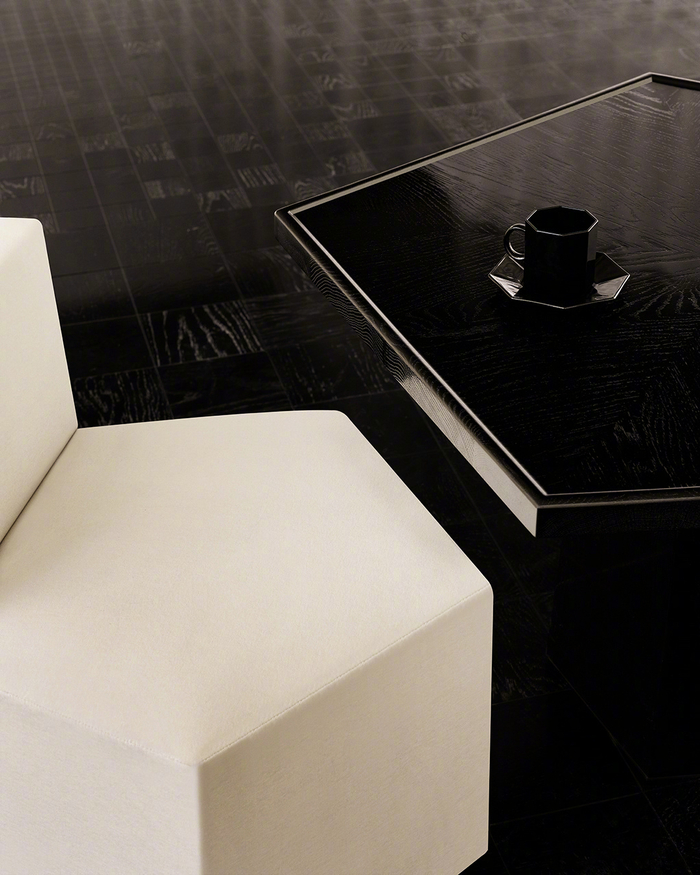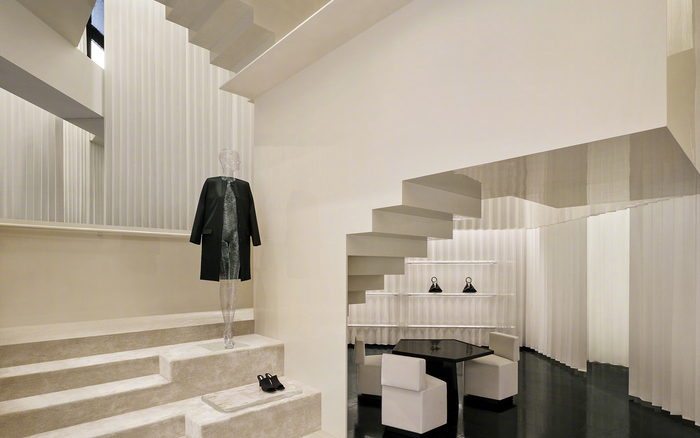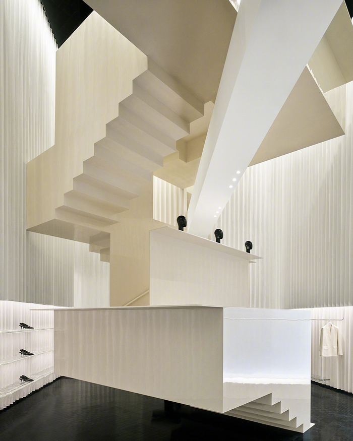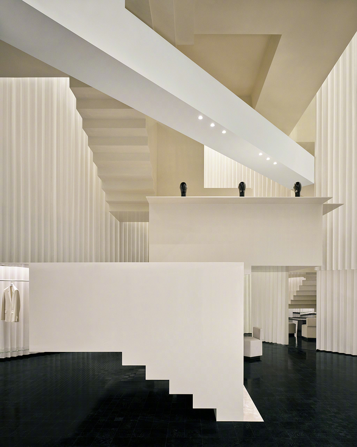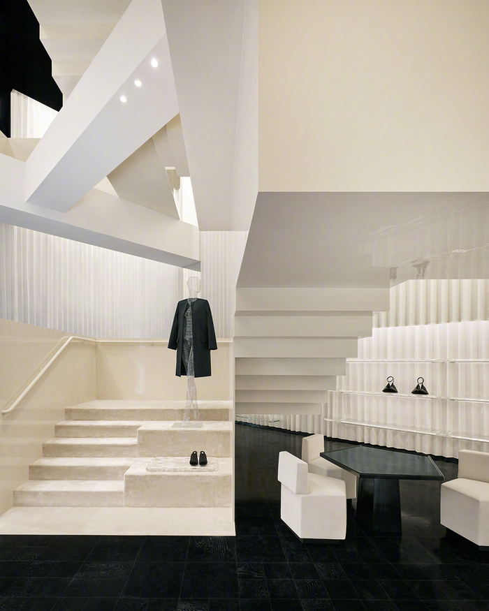 整个空间以TOTEME标志性的单色调为主,通过层层叠加的轻盈的艺术手法营造出视觉错觉。地板和天花板采用相匹配的高光泽黑色漆木纹理,凸显了空间的垂直感,而定制木质桌台则以相同材质从地面无缝延伸而出。成衣系列陈列在褶皱白色织物墙前,与建筑外立面形成柔和的呼应。配饰则陈列在如冰面般的波纹玻璃上,仿佛悬浮于空中,这一设计巧妙呼应了TOTEME的斯堪的纳维亚根源。