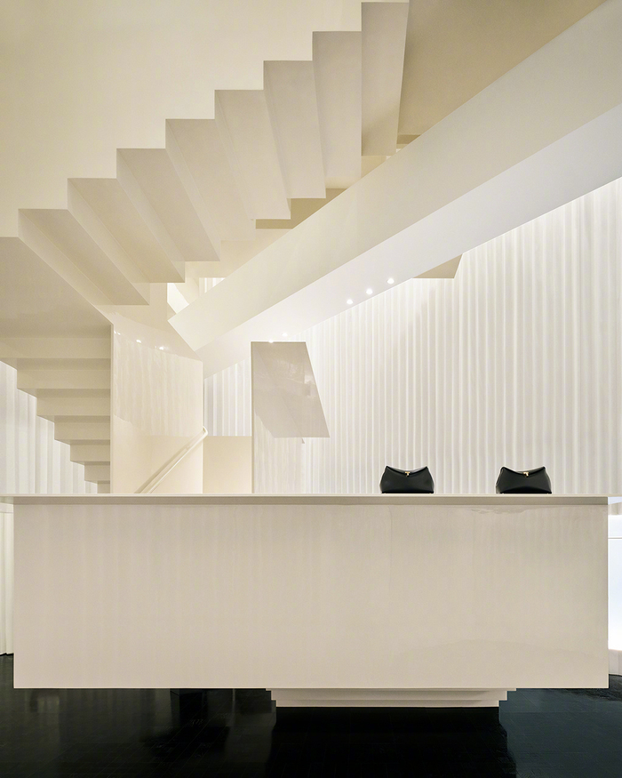 作为TOTEME在中国的首家旗舰店,设计师充分利用了原有建筑的自然形态和比例,打造出独特体验。双层转角建筑采用褶皱白色石材打造,向上延伸至白色金属,以TOTEME的雕塑美学风格屹立于北京东部三里屯区的中心地带,这里是一个集购物、餐饮和娱乐于一体的繁华区域。一条长达15米的长椅环绕着创新的建筑立面,巧妙隐藏的背光玻璃散发出柔和的光芒。