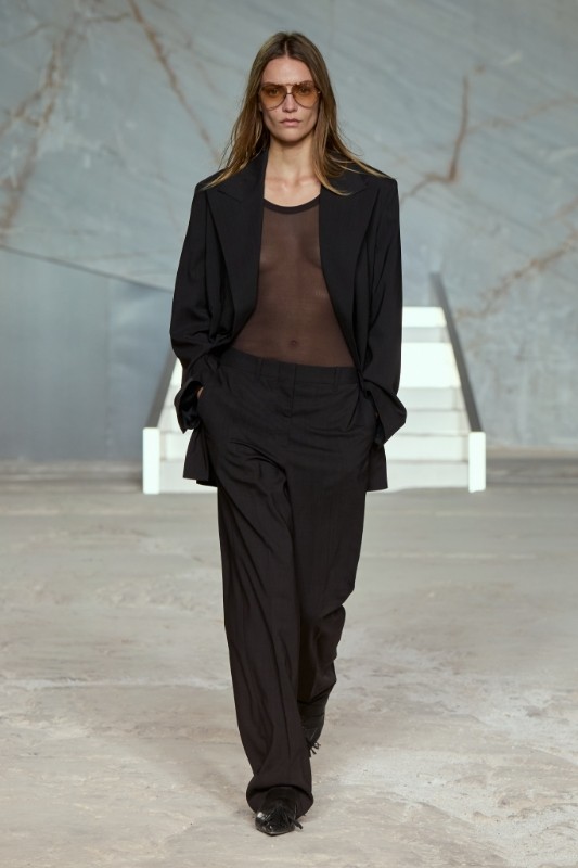 秀场粗犷的岩壁肌理与品牌极简美学形成强烈视觉对比。模特们沿镂空钢阶翩然而至,巧妙利用采石场的天然环形地貌,穿梭于矿洞之间,臻献35套全新春夏造型。流畅的时装廓形与坚硬的大理石背景碰撞出充满力量感的对白,巧妙诠释“力量与柔美”的平衡美学。