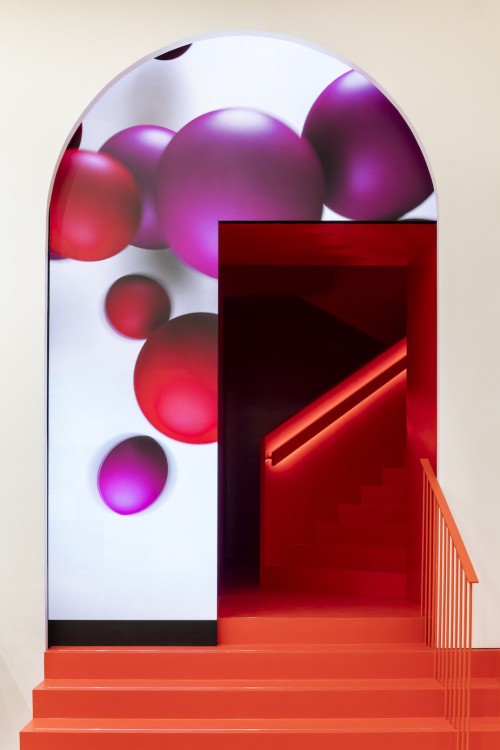 一楼空间以原始粗砺墙面、凝灰石元素与高耸拱顶对话整面LED巨幕轮播的数字内容,构筑过去与未来的“虚实共生”。中层过渡区以品牌标志性大胆红调打造单色沉浸空间,配以环绕楼梯的巨型光环装置与动态声光效果,引导宾客步入二楼住宅风格空间。二楼原始建筑中20世纪初的灰泥雕花与壁画经精心修复重现华彩,空间布局强调公寓式氛围,雕塑感门廊彰显永恒奢华。现代家具大师Mario Bellini(马里奥·贝里尼)的Camaleonda 变色龙沙发搭配法国家居品牌Pierre Frey(皮埃尔·弗雷)的Litho石头扶手椅,整个空间可持续高端建材与多维纹理贯穿始终。