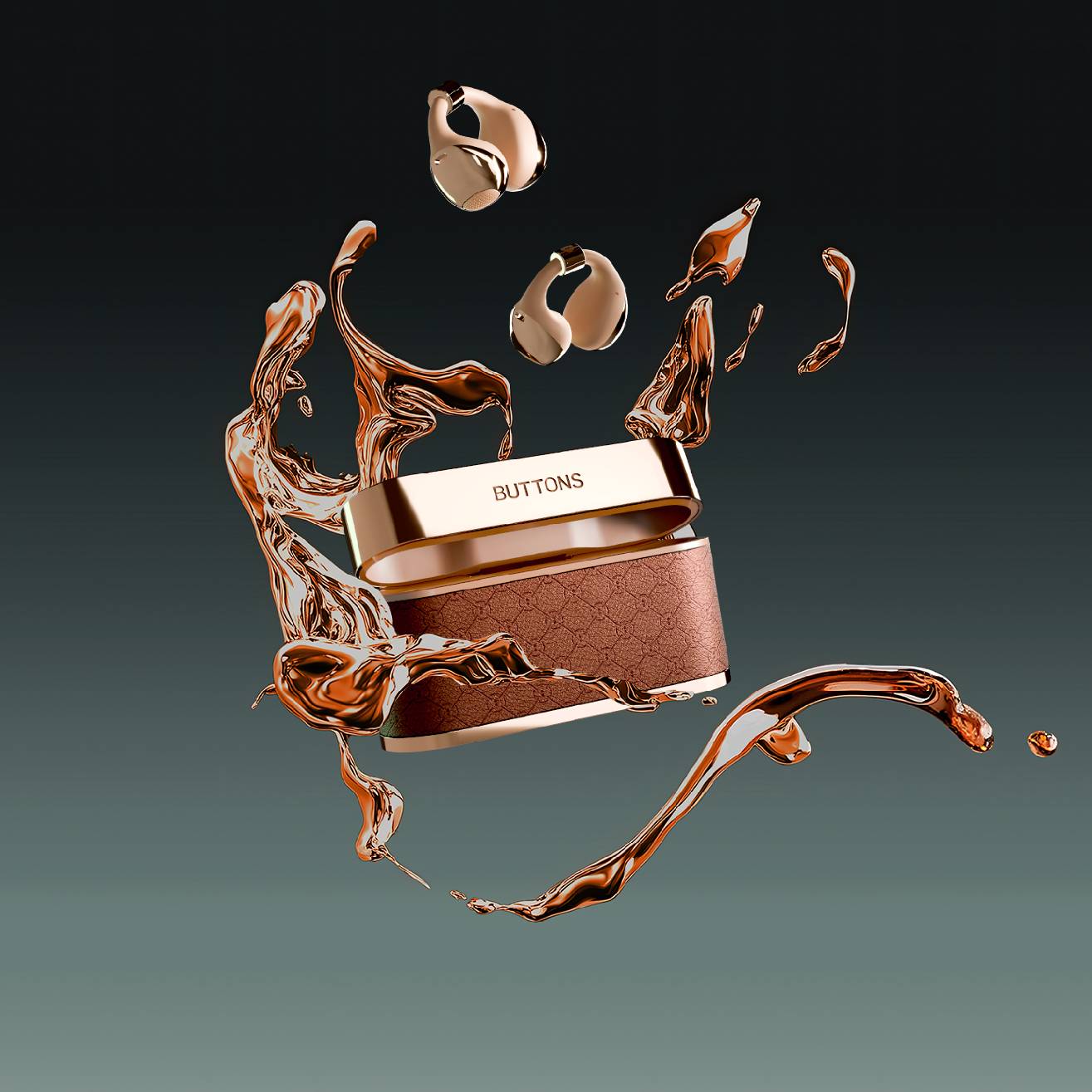 BUTTONS CLIP耳机拥有金棕、黑银双色两种奢品规格,配有质感包装,让每一次佩戴BUTTONS「小金砖」和「小银砖」,都能成为自我审美宣言。产品包装兼具奢华美学与实用价值,彰显BUTTONS对高端品质的不懈追求。其包装设计灵感源自品牌核心理念——纽扣(BUTTONS),象征着联结、包容与接纳多元美学的内涵。紧密交织的网状图形,仿若不同文化间的碰撞与融合,延伸出无限可能性。压纹皮革装点于产品表面,经典奢美印记与金属拉丝冷感巧妙对撞,尽绎摩登艺术风格,每一处细节都淋漓体现品牌的精湛工艺与创新精神。