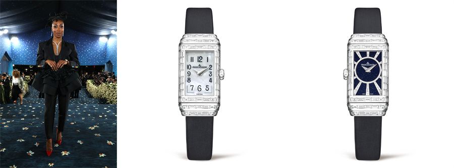 Ego Nwodim佩戴积家 Reverso One Duetto High Jewellery翻转系列高级珠宝腕表黑色丝缎表带款出席Met Gala(左)
