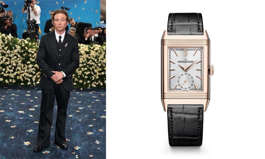 杰里米·艾伦·怀特(Jeremy Allen White)佩戴积家 Reverso Tribute Small Seconds 翻转系列小秒针腕表玫瑰金款出席Met Gala(左)