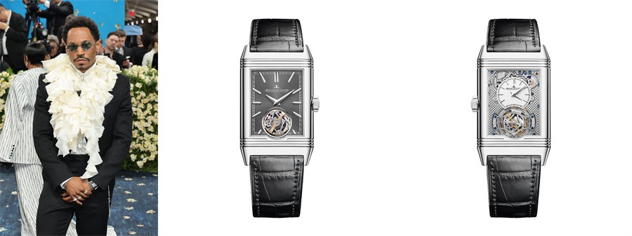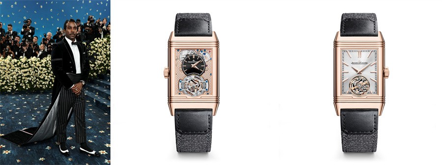 凯特拉纳达(Kaytranada)佩戴积家Reverso Tribute Duoface Tourbillon 翻转系列双面双时区陀飞轮腕表出席Met Gala(左)