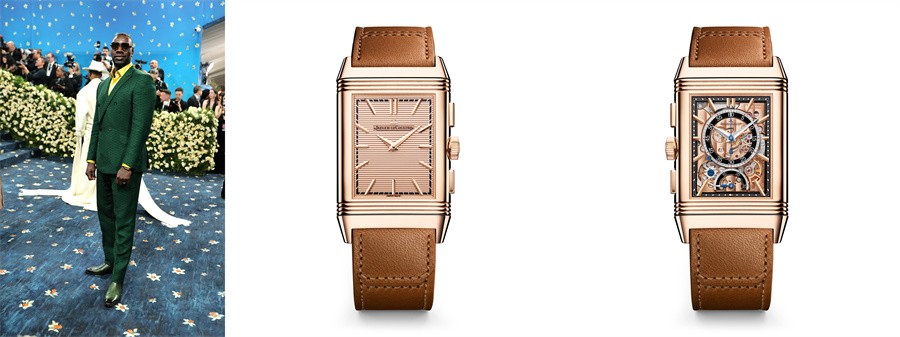奥玛·希(Omar Sy)佩戴积家Reverso Tribute Chronograph 翻转系列计时腕表玫瑰金款出席Met Gala(左)
