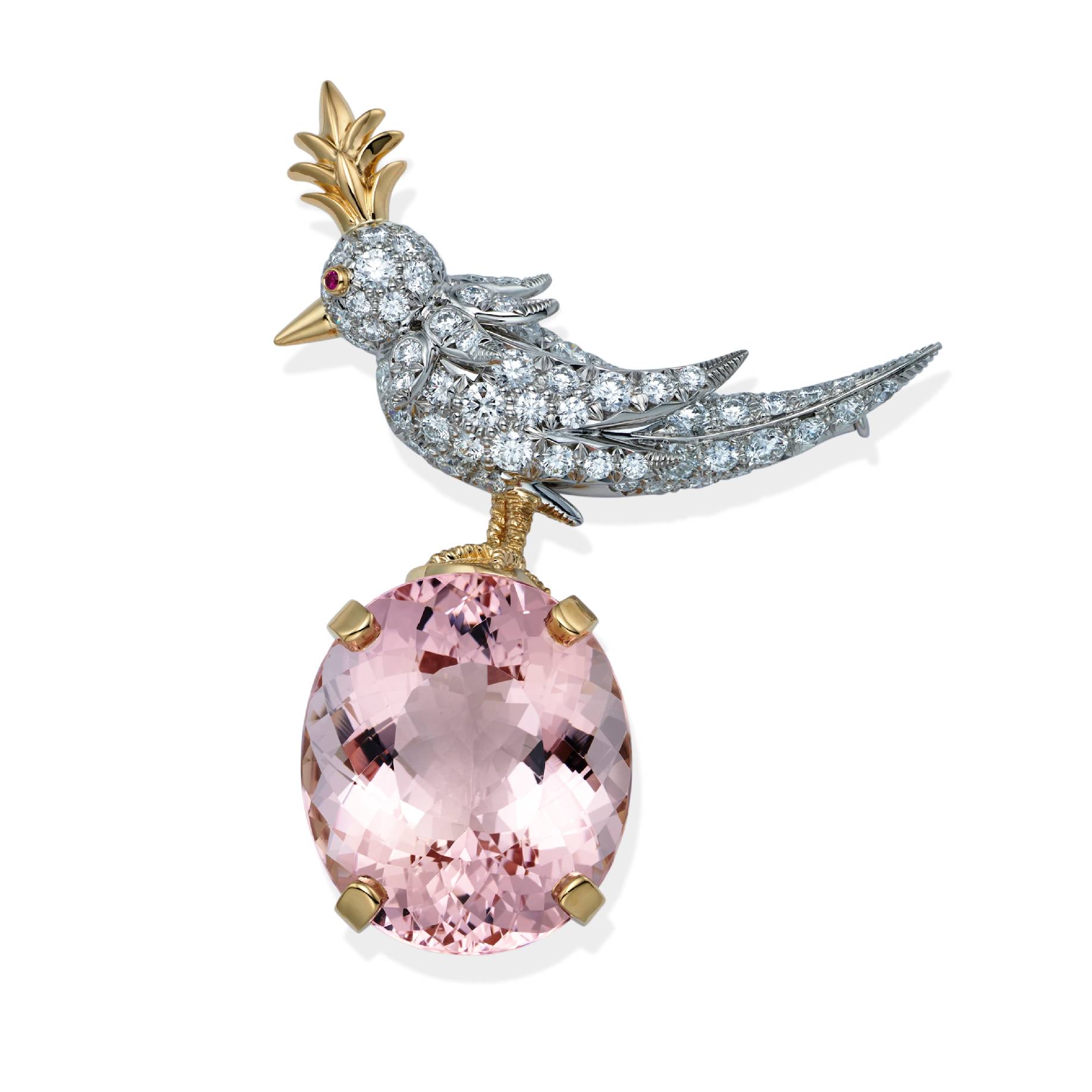 让·史隆伯杰被誉为史上最杰出的珠宝设计师之一。1956年至1987年间,他在蒂芙尼担任设计师逾三十载,成为当时珠宝风尚的引领者。这位自学成才的艺术家对自然世界满怀热爱,以非凡巧思和天马行空的想象力重新诠释飞鸟、动物、鱼类及花卉,进而创作出一系列梦幻且充满超现实感的杰作。凭借趣味横生的创意设计,让·史隆伯杰的众多作品成为20世纪珠宝设计的典范,尤其是创作于1965年的“石上鸟”胸针,生动呈现了一只镶钻小鸟栖息于一颗硕大彩色宝石之上的妙趣情景。