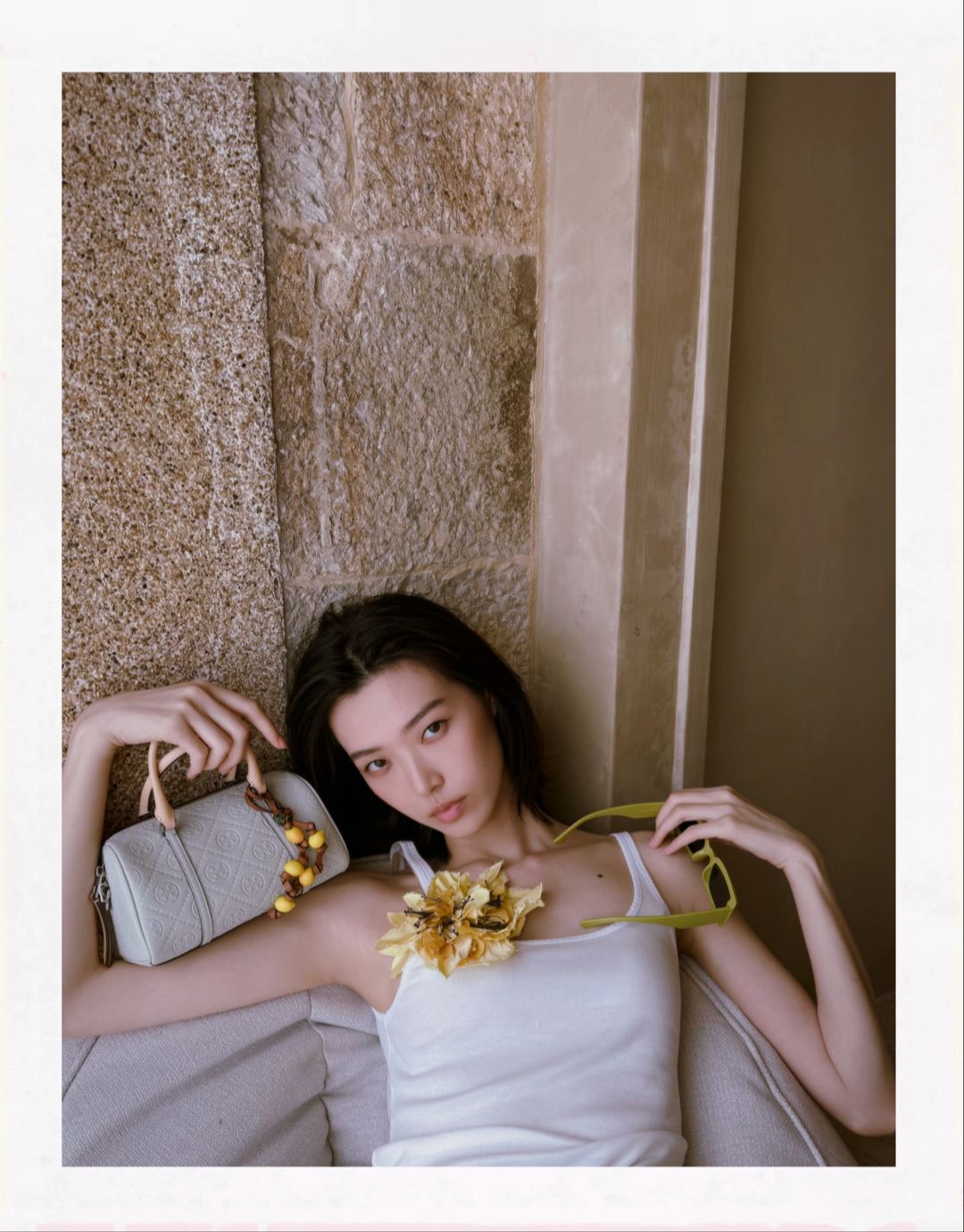 游天翼身着罗纹背心、花卉耳环,携T MONOGRAM软皮迷你酒桶包及柠檬包挂;