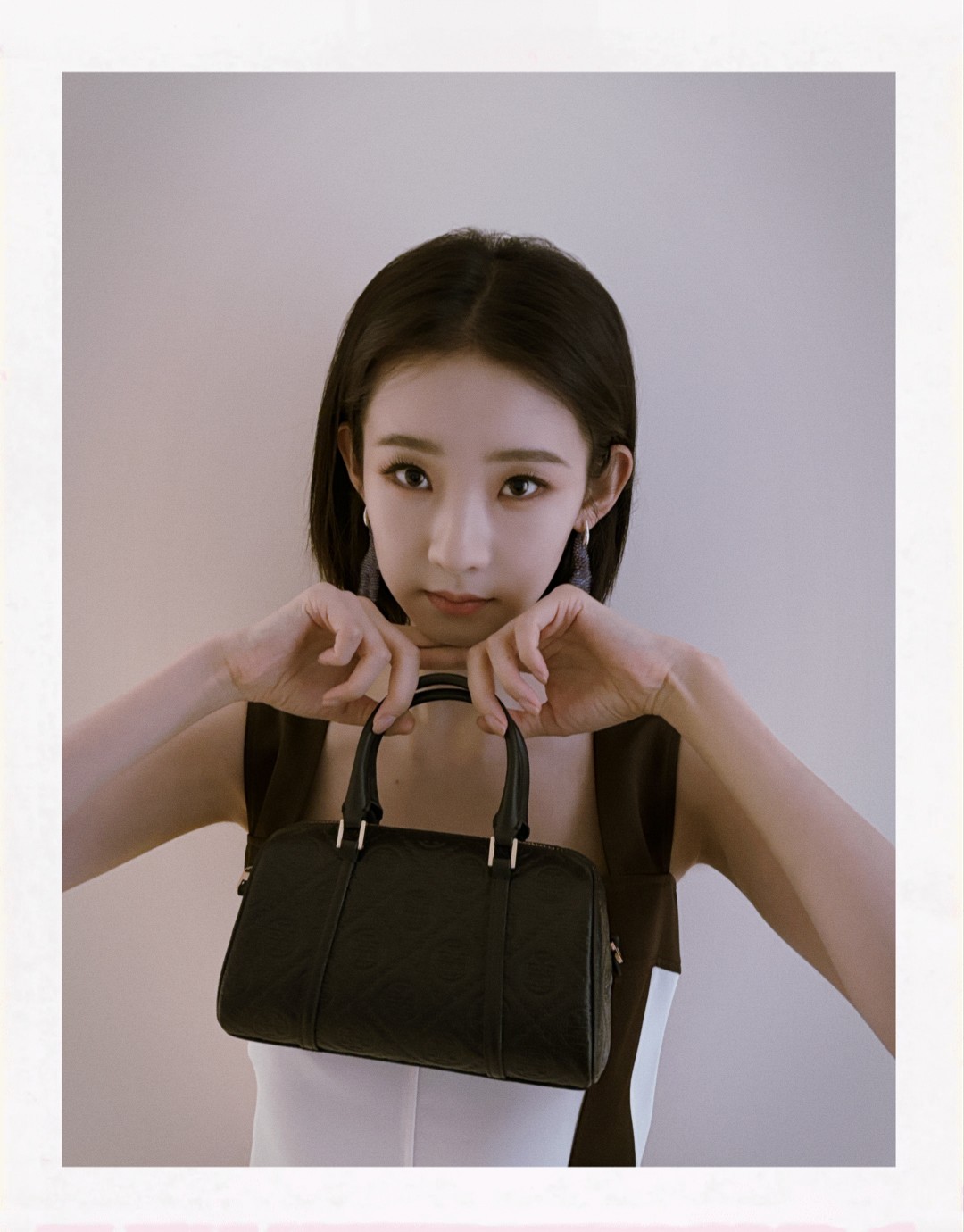 张艺凡身着缎面连衣裙、珊瑚环形耳环,携T MONOGRAM软皮迷你酒桶包;