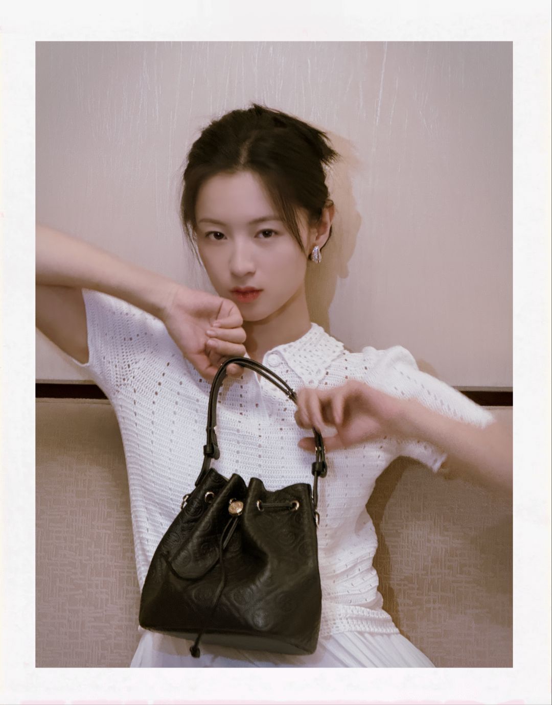 李嘉鑫身着钩针棉质 POLO衫、波浪形耳环、MONOGRAM不规则矩形太阳眼镜,携T MONOGRAM软皮水桶包。