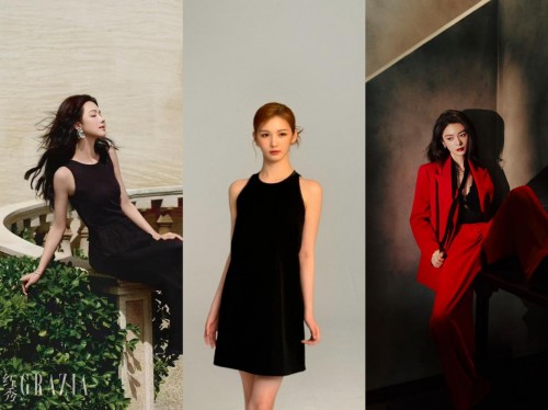 陈都灵的无袖连衣裙至简雅致,周子玄的直筒迷你裙温婉内敛,复古调色与大胆撞色在简约黑色中碰撞多元格调。傅菁的炽烈红西装以高饱和色调迸发存在感,宽松版型将锋芒与慵懒精致感并存。