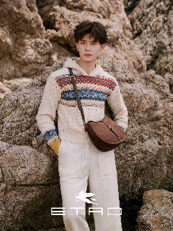 步入密林时,Etro全球品牌代言人任嘉伦身着提花毛衣,搭配羊毛条纹围巾、Essential迷你提花斜挎包, 自然色调满覆于着装之上;驻足海岸线时,花卉佩斯里衬衫的蓝色调与暮色交相掩映。Etro本季通过层次叠加与原始印花,将服装转化为承载文明的容器——在“出走”与“回归”的循环中,见证生命最本真的力量。